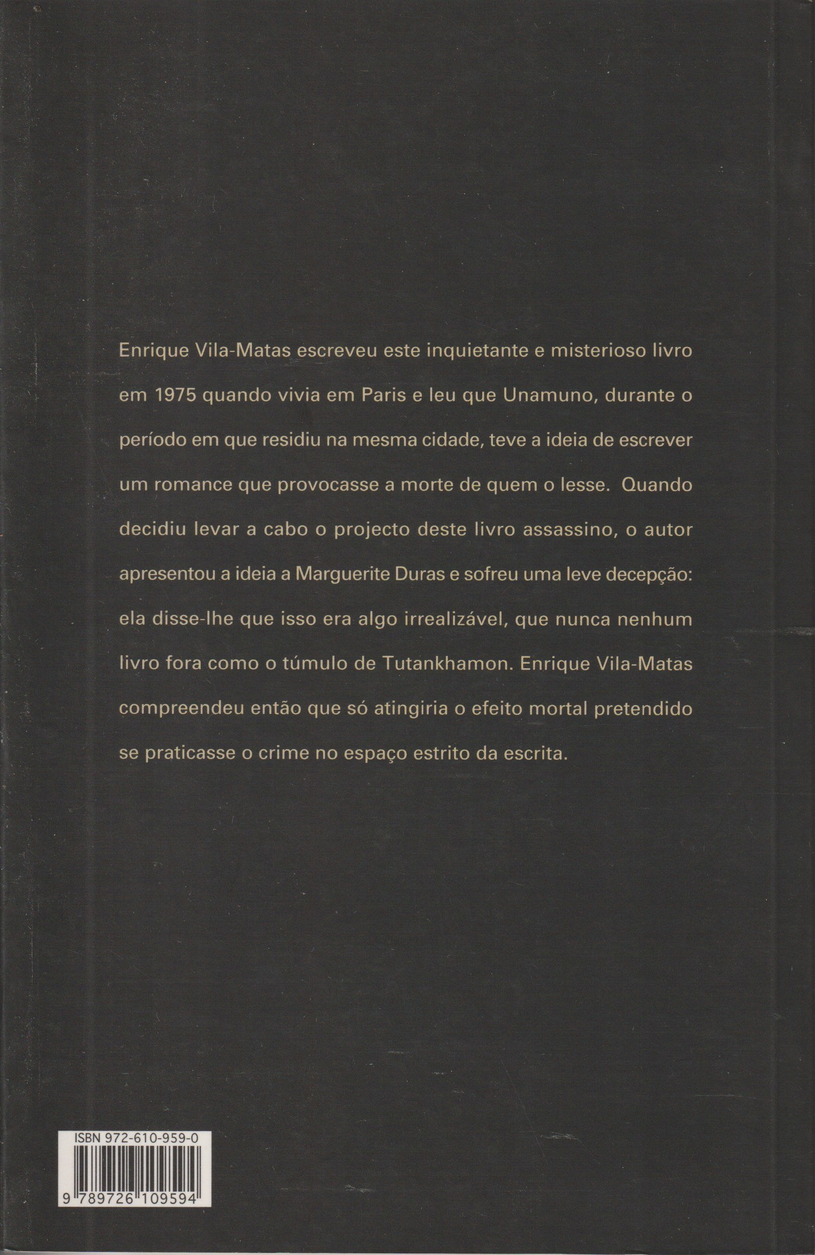 Enrique Vila-Matas escreveu este inquietante e misterioso livro em 1975 quando vivia em Paris e leu que Unamuno, durante o período em que residiu na mesma cidade, teve a ideia de escrever um romance que provocava a morte de quem o lesse. Quando decidiu levar a cabo o projecto deste livro assassino, o autor apresentou a ideia a Marguerite Duras e sofreu uma leve decepção: ela disse-lhe que isso era algo irrealizável, que nunca nenhum livro fora como o túmulo de Tutankhamon. Enrique Vila-Matas compreendeu então que só atingiria o efeito mortal pretendido se praticasse o crime no espaço estrito da escrita.