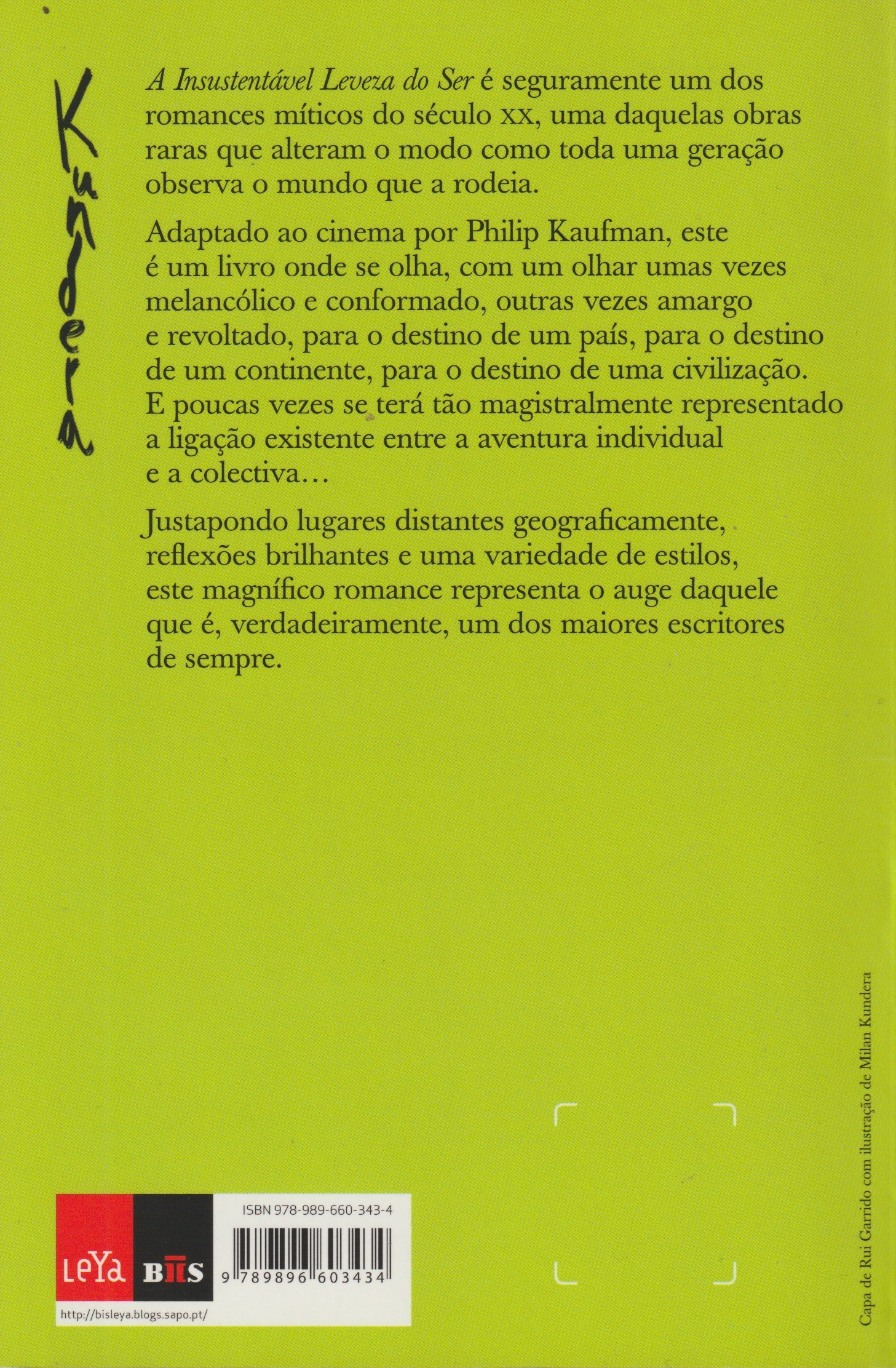 A Insustentável Leveza do Ser é seguramente um dos romances míticos do século XX, uma daquelas obras raras que alteram o modo como toda uma geração observa o mundo que a rodeia.