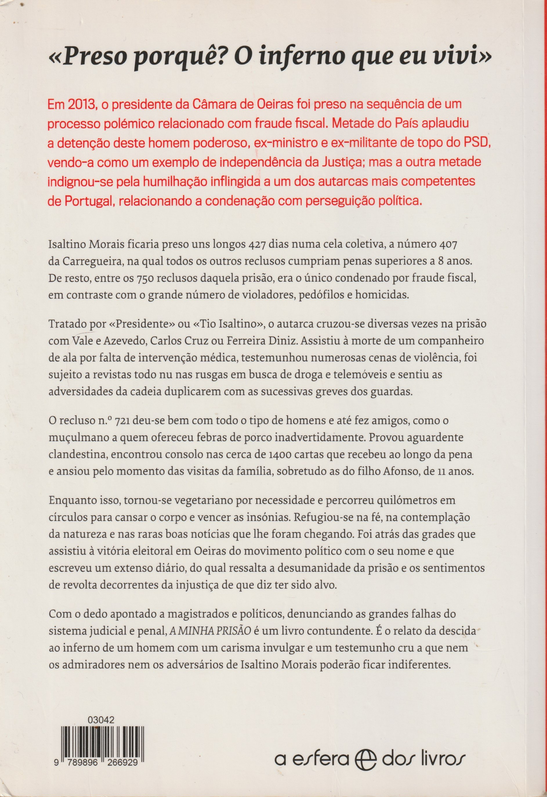 Isaltino Morais ficaria preso uns longos 429 dias. Habitou a cela colectiva 407 da Carregueira, numa ala onde todos os presos eram mais novos e cumpriam penas maiores do que ele. De resto, entre os 750 homens que constituíam a população prisional, o autarca era o único condenado por fraude fiscal, em contraste com o grande número de violadores, pedófilos e homicidas. Tratado por «Presidente» ou «Tio Isaltino», cruzou-se diversas vezes nos corredores e no pátio da prisão com Vale e Azevedo, Carlos Cruz ou Ferreira Diniz. Assistiu à morte de um companheiro de cela por falta de intervenção médica, testemunhou numerosas cenas de violência, foi sujeito a revistas todo nu nas rusgas em busca de droga e telemóveis e sentiu as adversidades da cadeia duplicarem com as sucessivas greves dos guardas. O recluso n.º 721 deu-se bem com todo o tipo de homens e até fez amigos, como o muçulmano a quem ofereceu secretos de porco inadvertidamente. Provou aguardente clandestina, encontrou consolo nas centenas de cartas que recebeu e ansiou pelo momento das visitas da família, sobretudo as do filho Afonso, de 11 anos. Enquanto isso, tornou-se vegetariano por necessidade, percorreu quilómetros em círculos para cansar o corpo e vencer as insónias. Refugiou-se na fé, na contemplação da natureza e nas raras boas notícias que lhe foram chegando. Foi atrás das grades que assistiu à vitória eleitoral do movimento político com o seu nome e que escreveu um extenso diário, do qual ressalta a desumanidade da prisão e os sentimentos de revolta decorrentes da injustiça de que diz ter sido alvo. Com o dedo apontado a magistrados e políticos, denunciando as grandes falhas do sistema judicial e penal, A Minha Prisão é um livro contundente. É o relato da descida ao inferno de um homem com um carisma invulgar e um testemunho cru a que nem os admiradores nem os adversários de Isaltino Morais poderão ficar indiferentes.