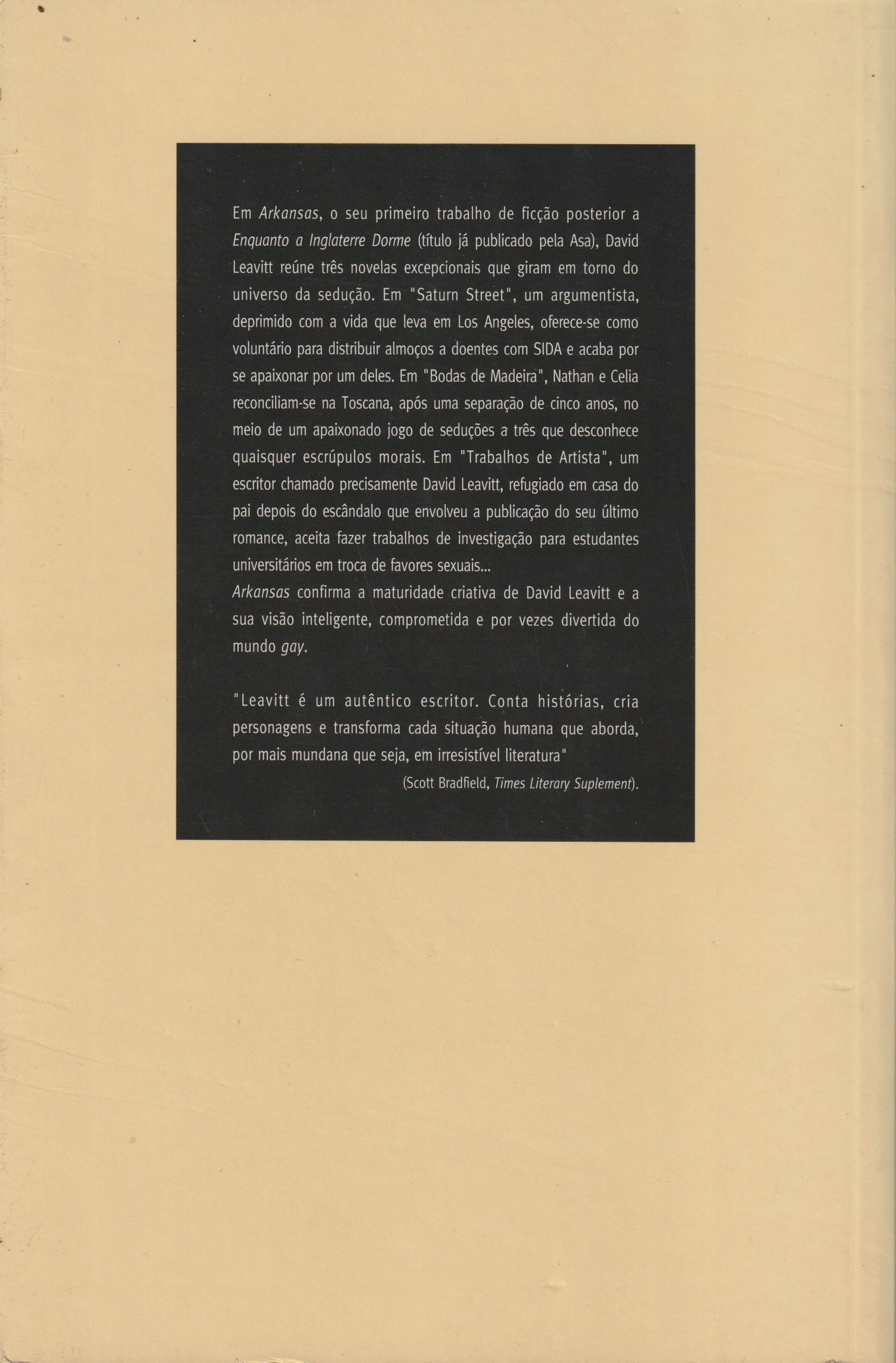 Em Arkansas, o seu primeiro trabalho de ficção, posterior a Enquanto a Inglaterra Dorme (título já publicado pela ASA), David Leavitt reúne três novelas excepcionais que giram em torno do universo da sedução.