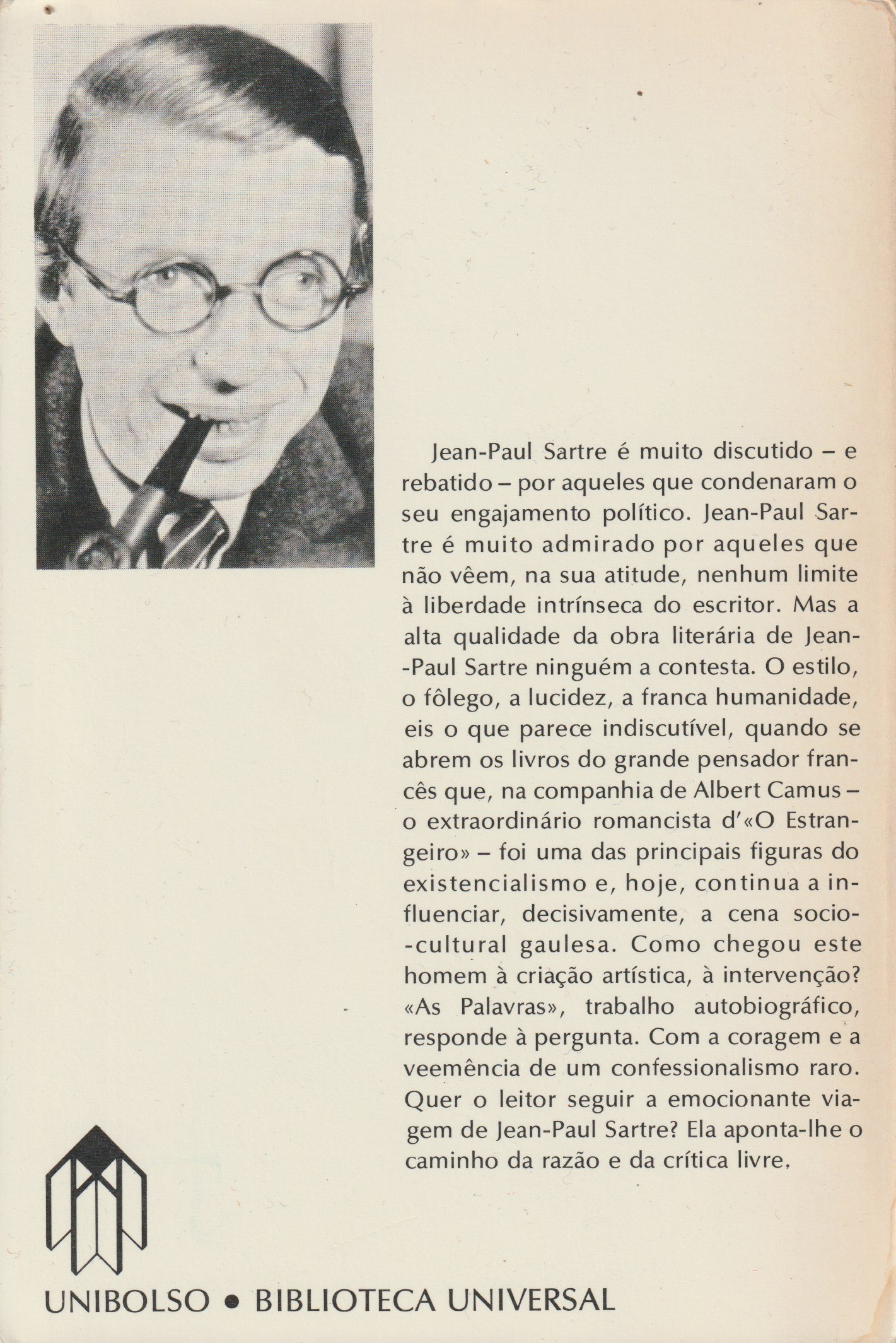 Jean-Paul Sartre era uma criança de colo quando o pai morreu. Esse acontecimento, considera, moldou definitivamente a sua vida: se a mãe se viu acorrentada ao triste papel de jovem viúva, ele cresceu livre, adorado por todos, acolhido em especial por um avô dedicado que lhe abriu as portas da sua biblioteca e o convidou a explorá-la. «Comecei a minha vida como provavelmente a irei terminar: no meio dos livros», lemos nestas páginas dadas à estampa poucos meses antes de a Academia Sueca anunciar a atribuição a Sartre do Nobel da Literatura, em 1964. Evocando a França provinciana do período que antecedeu a Primeira Guerra Mundial e uma infância entregue a uma imaginação sem limites, alimentada pela leitura e pela descoberta da escrita, As Palavras é simultaneamente o retrato de um tempo, uma reflexão sobre o lugar dos livros e da linguagem na construção da experiência humana e uma brilhante autoanálise de um dos maiores pensadores do século xx.