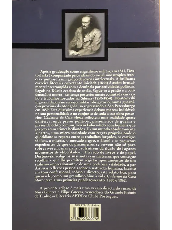 Traduzido directamente a partir do russo pelos vencedores do 'Grande Prémio de Tradução Literária APT/Pen Clube Português', Nina Guerra e Filipe Guerra, a Presença publica mais um clássico de Dostoiévski. Cadernos da Casa Morta foi inicialmente publicado entre 1860 e 1862 e reflecte uma realidade quase dantesca, onde presos políticos, prisioneiros de guerra e presos de delito comum, vivem lado-a-lado com homens que perpetraram crimes hediondos. É um mundo “absolutamente à parte”, uma micro-sociedade com regras próprias onde o quotidiano se reparte entre os trabalhos forçados, os castigos sádicos, a miséria, o mercado negro, o álcool e os pequenos expedientes de que os prisioneiros se servem não só para sobreviverem, mas para usufruirem da ilusão de fugazes momentos de liberdade. Privado de livros e papel, Dostoiévski redige as suas notas em materiais que consegue recolher e que lhe permitem registar apontamentos de um realismo impressionante, a par das suas reflexões pessoais sobre a natureza humana. Escrito em tom confessional, sóbrio e directo, este relato fica, para quem o lê, como um grandioso hino à vida.