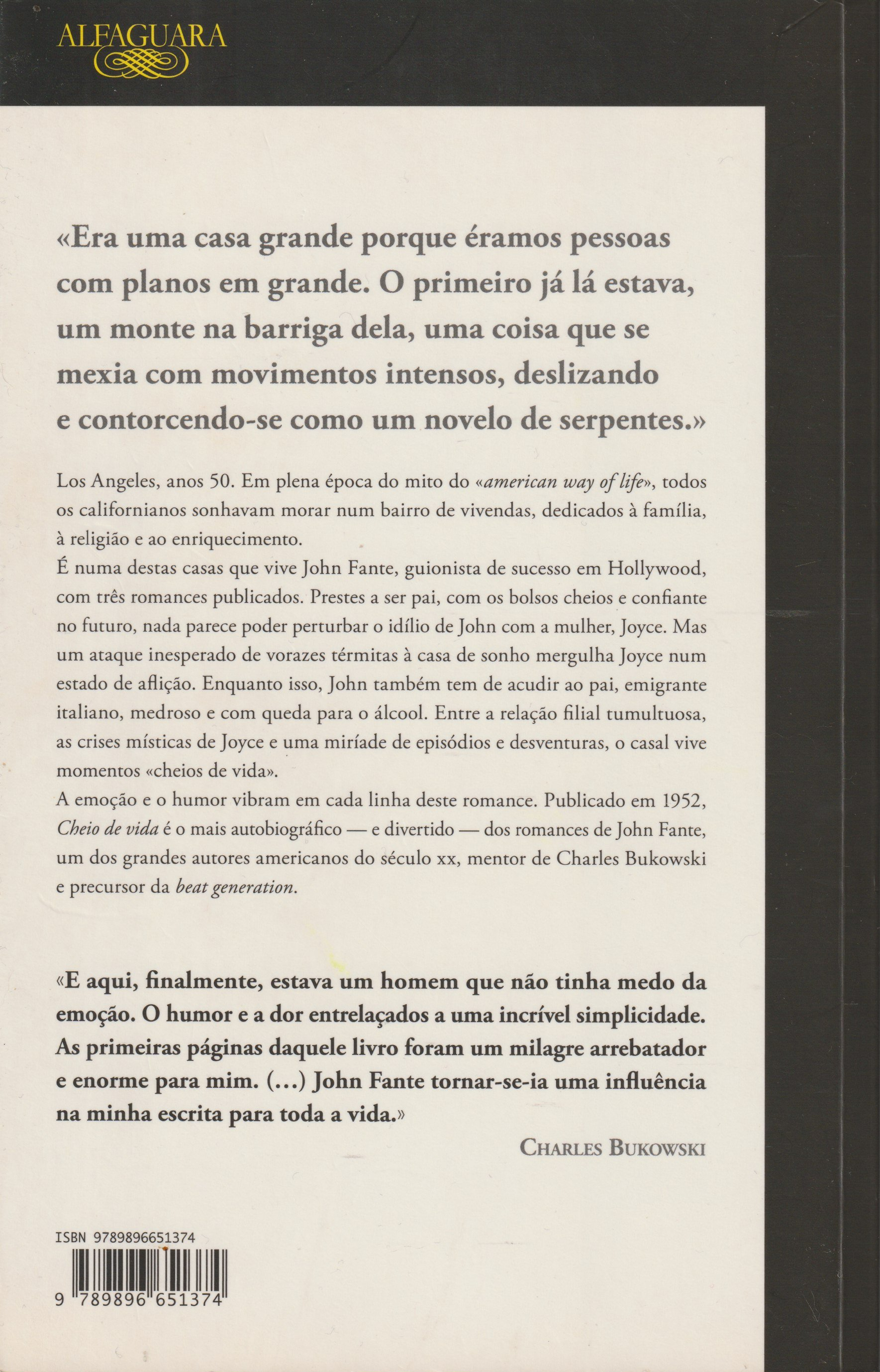 Entre a ficção e a autobiografia, Cheio de Vida é contado na primeira pessoa por uma personagem chamada John Fante. É um livro cheio de vida: uma mistura de comédia e drama povoado por personagens fortíssimos, como Nick Fante, o pai, teimoso e terno, dedicado à família e ao seu ofício. E é ainda uma história forte e comovente sobre laços familiares que contribui de forma notável para a herança literária multiétnica dos Estados Unidos.