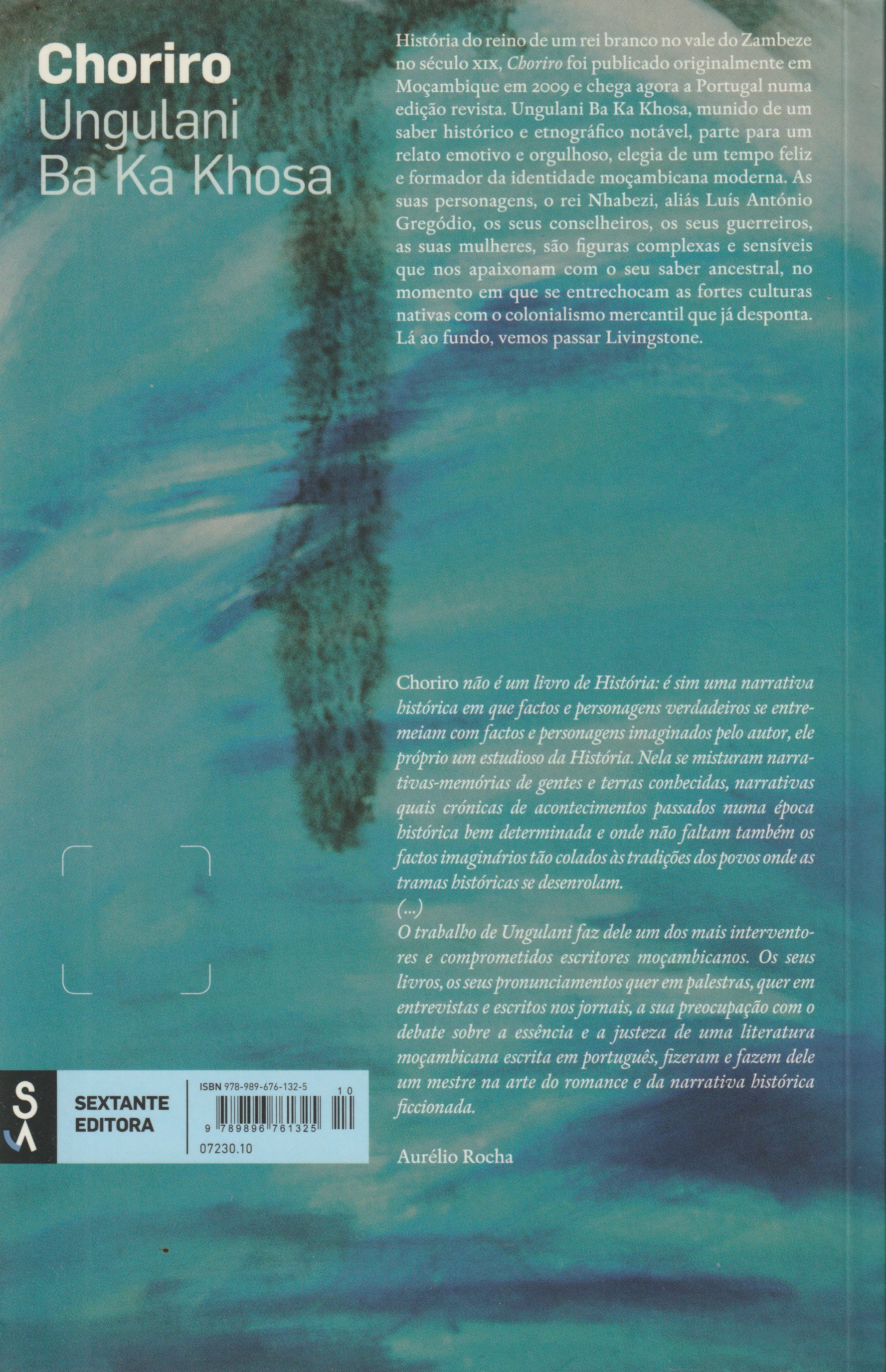 História do reino de um rei branco no vale do Zambeze no século XIX, Choriro foi publicado originalmente em Moçambique em 2009 e chega agora a Portugal numa edição revista. Ungulani Ba Ka Khosa, munido de um saber histórico e etnográfico notável, parte para um relato emotivo e orgulhoso, elegia de um tempo feliz e formador da identidade moçambicana moderna. As suas personagens, o rei Nhabezi, aliás Luís António Gregódio, os seus conselheiros, os seus guerreiros, as suas mulheres, são figuras complexas e sensíveis que nos apaixonam com o seu saber ancestral, no momento em que se entrechocam as fortes culturas nativas com o colonialismo mercantil que já desponta. Lá ao fundo, vemos passar Livingstone.