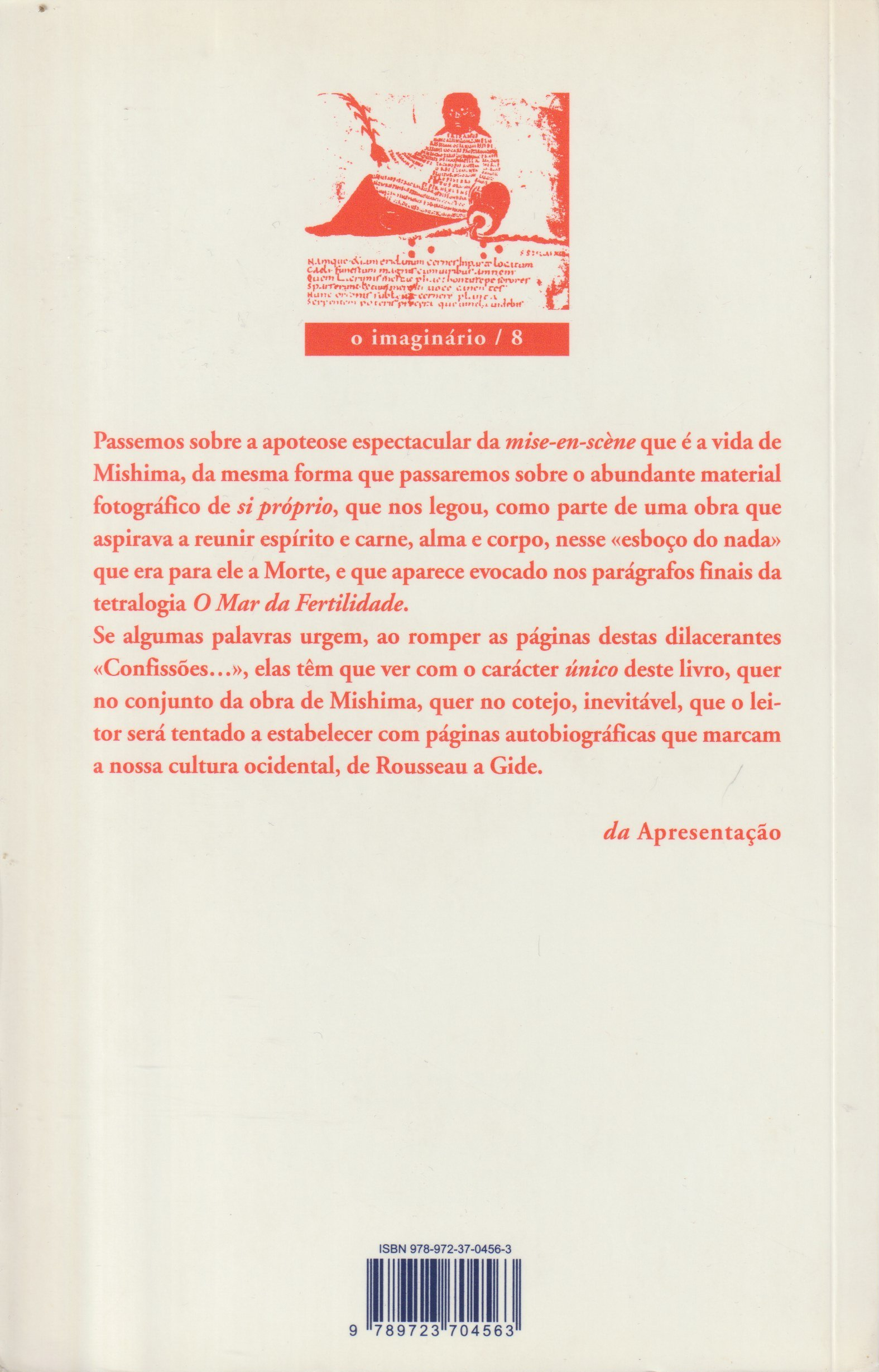 Se algumas palavras urgem, ao romper as páginas destas dilacerantes «Confissões…», elas têm que ver como carácter único deste livro, quer no conjunto da obra de Mishima, quer no cotejo, inevitável, que o leitor será tentado a estabelecer com páginas autobiográficas que marcam a nossa cultura ocidental, de Rousseau a Gide.