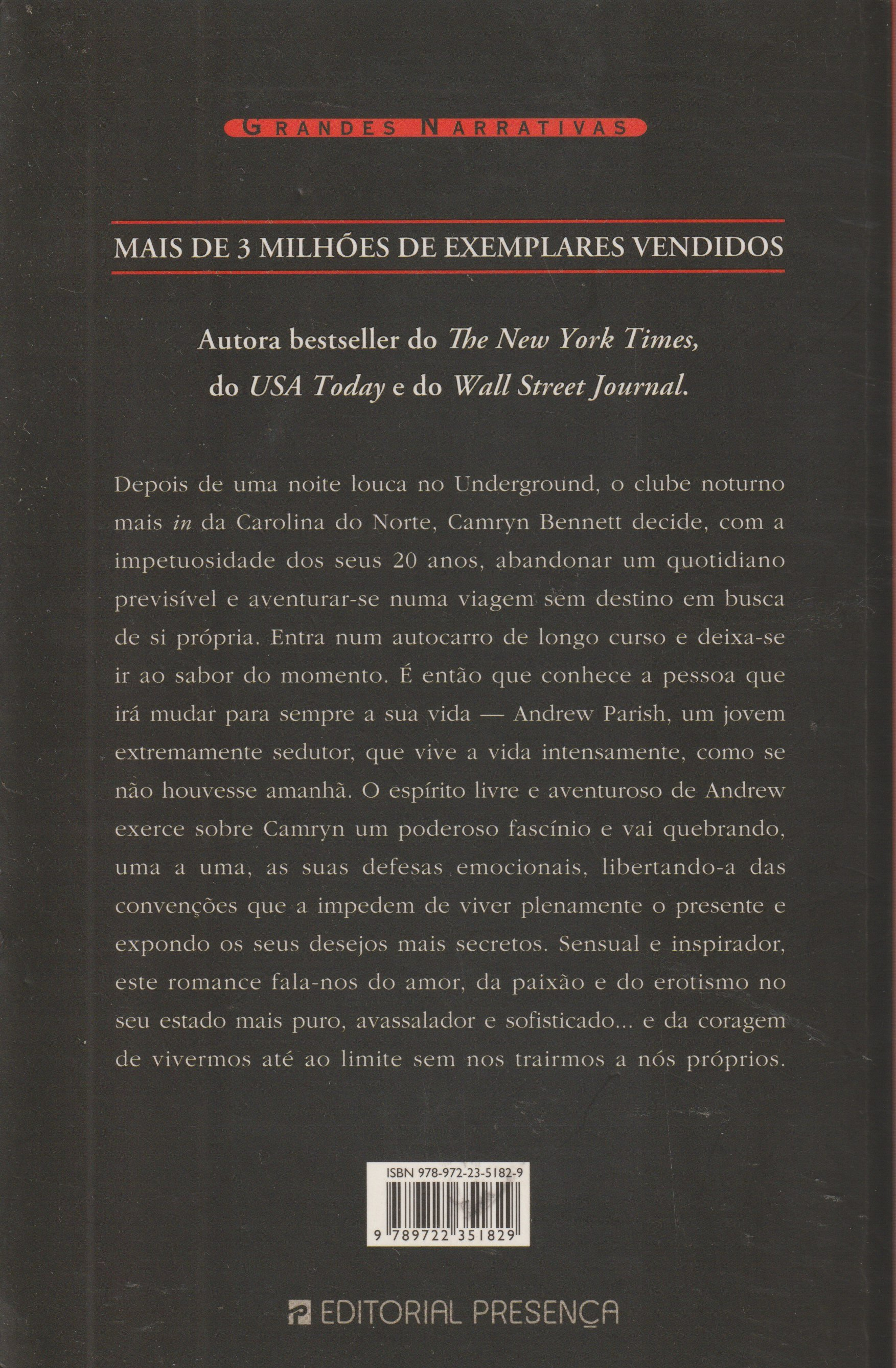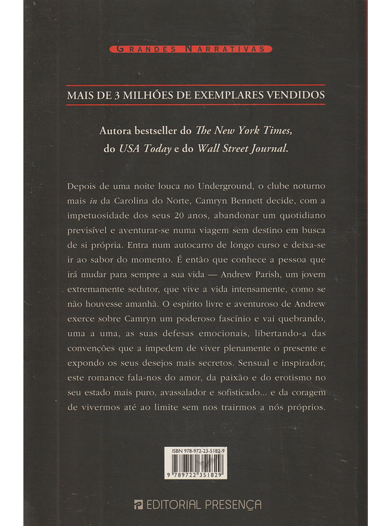 Camryn Bennett decide, com a impetuosidade dos seus 20 anos, abandonar um quotidiano previsível e aventurar-se numa viagem sem destino em busca de si própria. Entra num autocarro de longo curso e deixa-se ir ao sabor do momento. É então que conhece a pessoa que irá mudar para sempre a sua vida - Andrew Parish, um jovem que vive a vida intensamente. O espírito livre e aventuroso de Andrew exerce sobre Camryn um poderoso fascínio e, pouco a pouco, vai quebrando as suas defesas, libertando-a das convenções que a impedem de viver plenamente o presente e expondo os seus desejos mais secretos. Sensual e inspirador, este romance fala-nos do amor, da paixão, do erotismo... e da coragem de vivermos até ao limite sem nos trairmos a nós próprios.