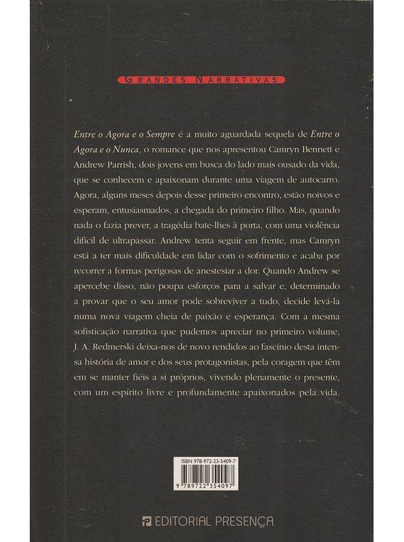 Sinopse: Entre o Agora e o Sempre é a muito aguardada sequela de Entre o Agora e o Nunca, o romance que nos apresentou Camryn Bennett e Andrew Parrish, dois jovens em busca do lado mais ousado da vida, que se conhecem e apaixonam durante uma viagem de autocarro. Agora, alguns meses depois desse primeiro encontro, estão noivos e esperam, entusiasmados, a chegada do primeiro filho. Mas, quando nada o fazia prever, a tragédia bate-lhes à porta. J. A. Redmerski deixa-nos de novo rendidos ao fascínio desta intensa história de amor e dos seus protagonistas, pela coragem que têm em se manter fiéis a si próprios, vivendo plenamente o presente, com um espírito livre e profundamente apaixonados pela vida.