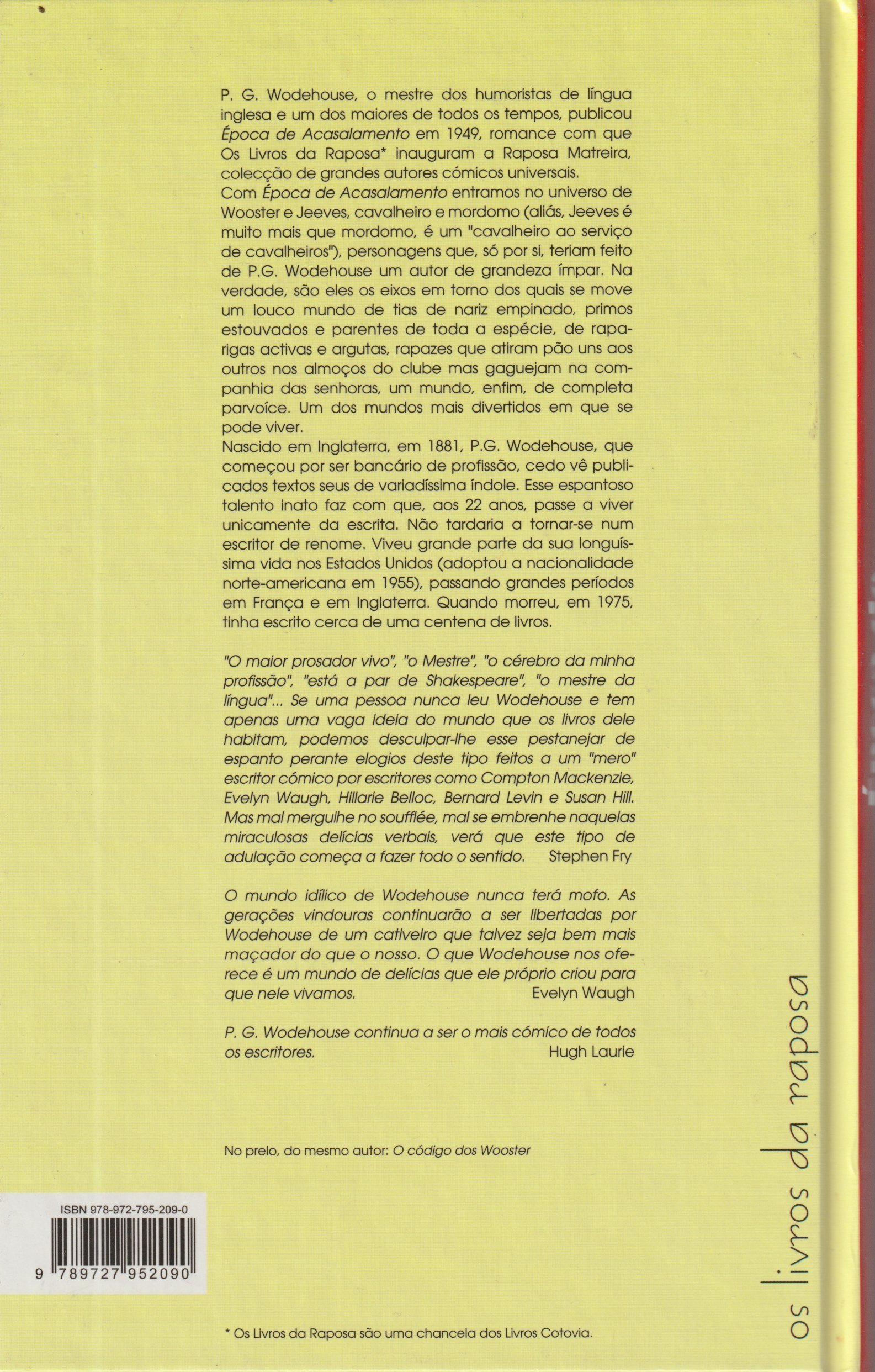 Época de Acasalamento, o primeiro dos vários romances de P. G. Wodehouse a ser publicado na Raposa Matreira, convida-nos a entrar no universo de Wooster e Jeeves, cavalheiro e mordomo, personagens que funcionam como eixos em torno dos quais se move um louco mundo de tias de nariz empinado, primos estouvados e parentes de todas as espécies, de raparigas activas e argutas, rapazes que atiram pão uns aos outros nos almoços do clube mas gaguejam na companhia das senhoras, um mundo, enfim, de completa parvoíce. Um dos mundos mais divertidos em que se pode viver.