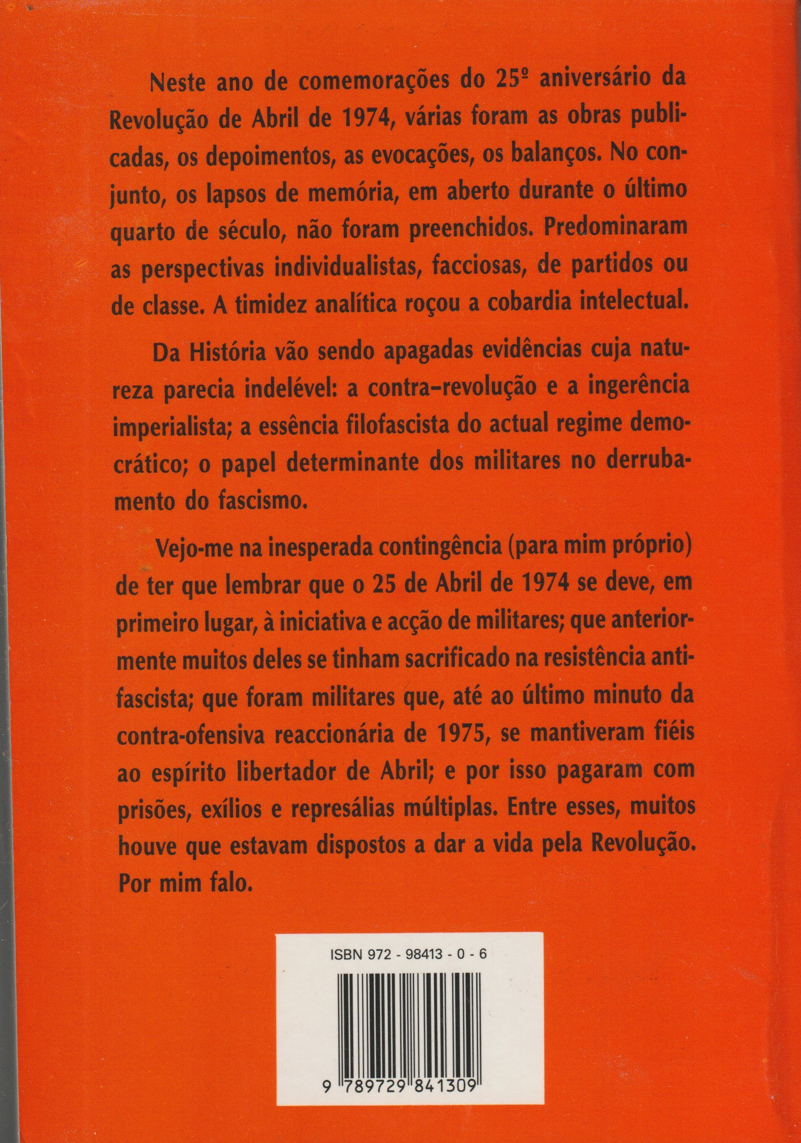 Vejo-me na inesperada contingência (para mim próprio) de ter que lembrar que o 25 de Abril de 1974 se deve, em primeiro lugar, à iniciativa e ação de militares, que anteriormente muitos deles se tinham sacrificado na resistência antifascista; que foram militares que, até ao último minuto da contra-ofensiva reaccionária de 1975, se mantiveram fiéis ao espírito libertador de Abril; e por isso pagaram com prisões, exílios e represálias múltiplas. Entre esses, muitos houve que estavam dispostos a dar a vida pela Revolução. Por mim falo.»