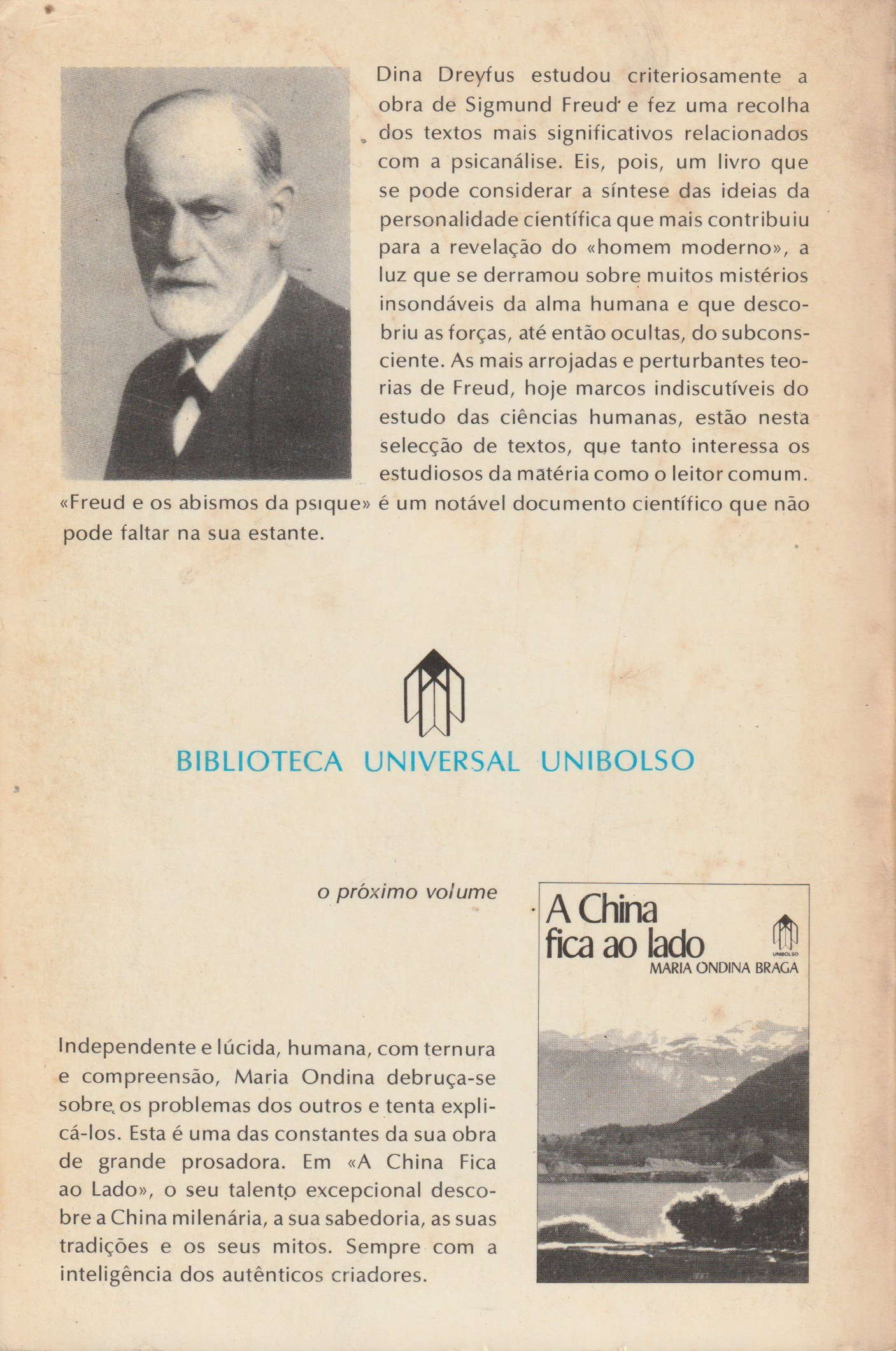 Título: Freud e os abismos da psiqueAutor: Dina DreyfusEditora: Livros UnibolsoTema: PsicologiaEstado: 4Língua: PortuguêsEncadernação: BrochadoAno: 1976Páginas: 255Dimensões: 12*18Preço: 5,00 €Observações: Esgotado no Mercado