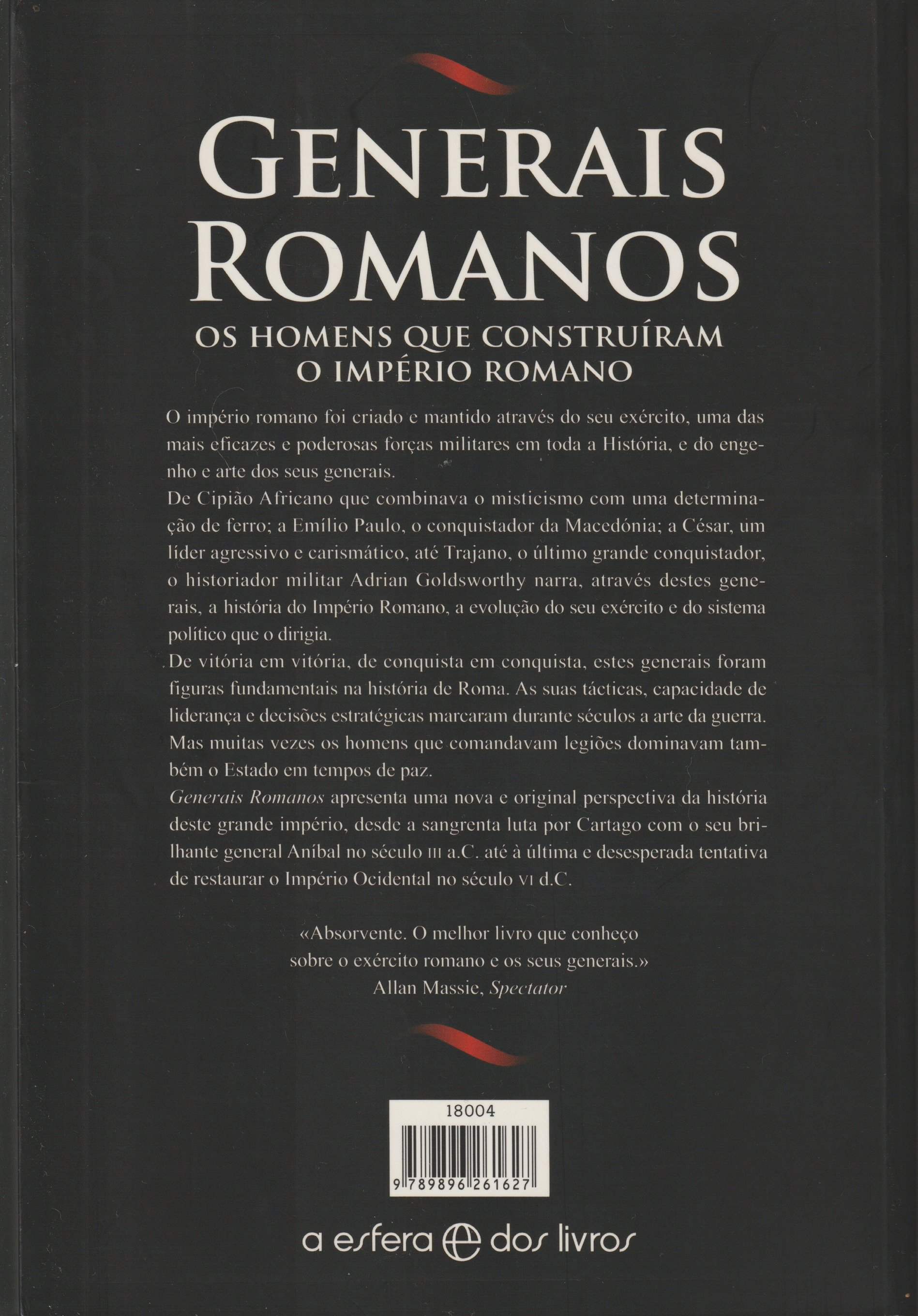O império romano foi criado e mantido através do seu exército, uma das mais eficazes e poderosas forças militares em toda a História, e do engenho e arte dos seus generais. De Scipio, Africanus que combinava o misticismo com uma determinação de ferro; a Aemilius Paullus, o conquistador da Macedónia; a Caesar, um líder agressivo e carismático, até Trajano o último grande conquistador, o historiador militar Adrian Goldsworthy narra, através destes generais, a história do Império Romano, a evolução do seu exército e do sistema político que o dirigia. De vitória em vitória, de conquista em conquista, estes generais foram figuras fundamentais na história de Roma. As suas tácticas, capacidade de liderança e decisões estratégicas marcaram durante séculos a arte da guerra. Mas, muitas vezes os homens que comandavam legiões dominavam também o Estado em tempos de paz.