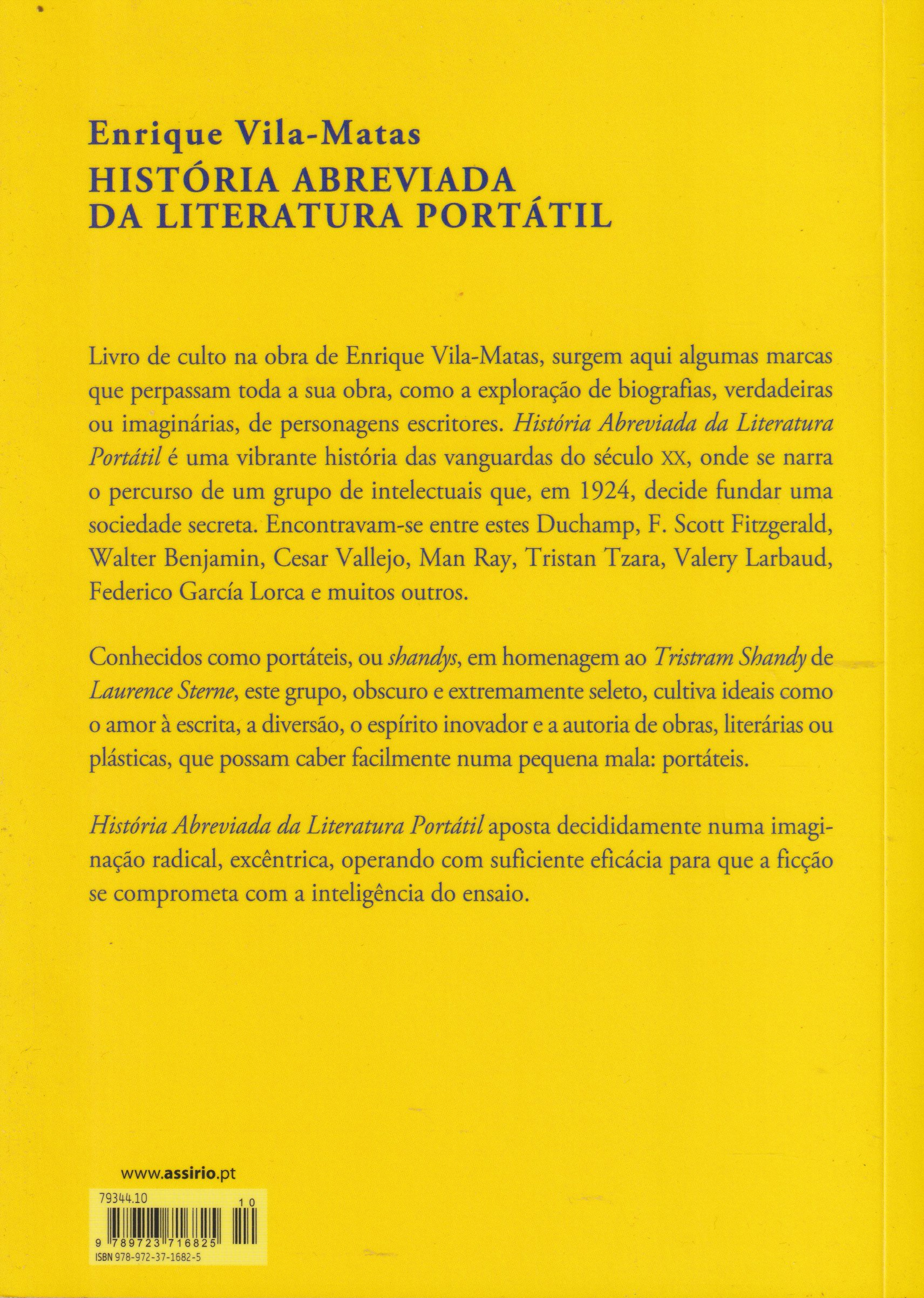 Livro de culto na obra de Enrique Vila-Matas, surgem aqui algumas marcas que perpassam toda a sua obra, como a exploração de biografias, verdadeiras ou imaginárias, de personagens escritores. História Abreviada da Literatura Portátil é uma vibrante história das vanguardas do século XX, onde se narra o percurso de um grupo de intelectuais que, em 1924, decide fundar uma sociedade secreta. Encontravam-se entre estes Duchamp, F. Scott Fitzgerald, Walter Benjamin, Cesar Vallejo, Man Ray, Tristan Tzara, Valery Larbaud, Federico García Lorca e muitos outros.