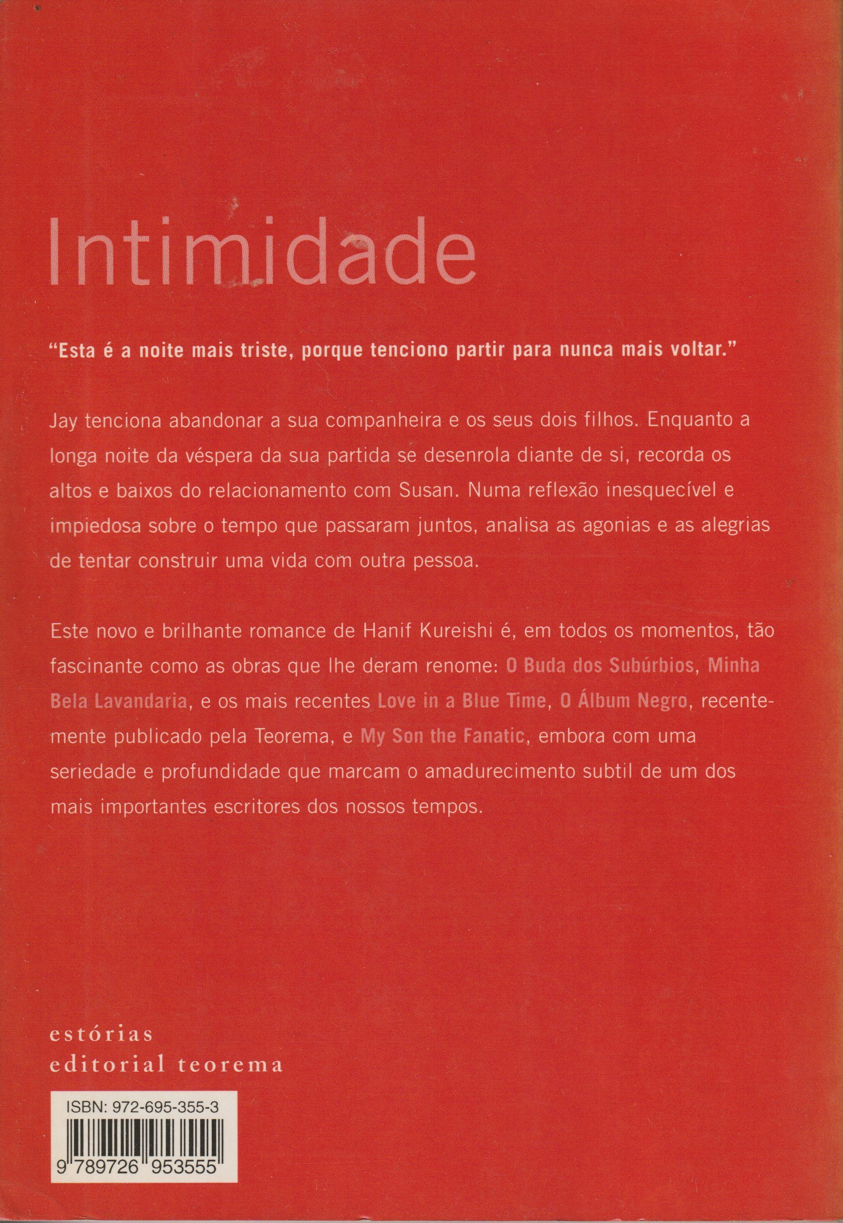 Hanif Kureishi, escritor inglês de origem paquistanesa, para além dos livros, tem também escrito argumentos para filmes ("A Minha Bela Lavandaria", "O Meu Filho Fanático"). Desta vez foi o dramaturgo e realizador Patrice Chéreau que adaptou o seu romance "Intimidade" (a partir de uma ideia que lhe surgiu de um dos contos de "Amor em Tempos Tristes", também de Kureishi). No livro, Jay decide abandonar mulher e filhos e tenta um relacionamento com outra mulher, em moldes bastante diferentes dos instituídos. Kureishi no seu melhor, fala-nos, como sempre, dos medos, da solidão, do sexo, do amor, dos encontros e desencontros entre personagens que nos dá a ver mas não julga. Pessoas tão estranhas ou tão normais como todos nós.