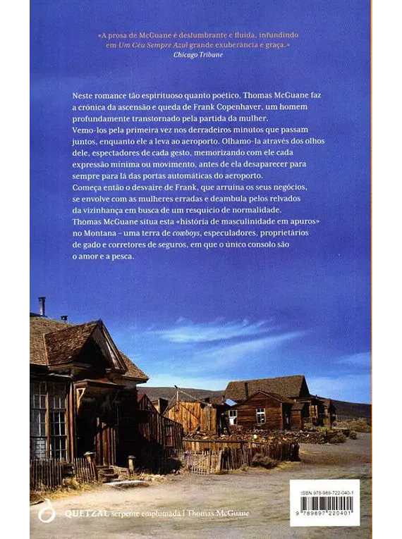 Neste romance tão espirituoso quanto lírico, Thomas McGuane faz a crónica da ascensão e queda de Frank Copenhaver, um homem profundamente transtornado pela partida da mulher. Vemo-los pela primeira vez nos derradeiros minutos que passam juntos, enquanto ele a leva ao aeroporto. Olhamo-la através dos olhos dele, espetadores de cada gesto, memorizando com ele a expressão mínima ou movimento, antes que ela desapareça para sempre para lá das portas automáticas da gare aérea.