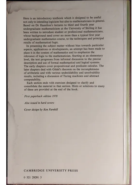 Intended for logicians and mathematicians, this text is based on Dr. Hamilton's lectures to third and fourth year undergraduates in mathematics at the University of Stirling. With a prerequisite of first year mathematics, the author introduces students and professional mathematicians to the techniques and principal results of mathematical logic. In presenting the subject matter without bias towards particular aspects, applications or developments, it is placed in the context of mathematics. To emphasize the level, the text progresses from informal discussion to the precise description and use of formal mathematical and logical systems.