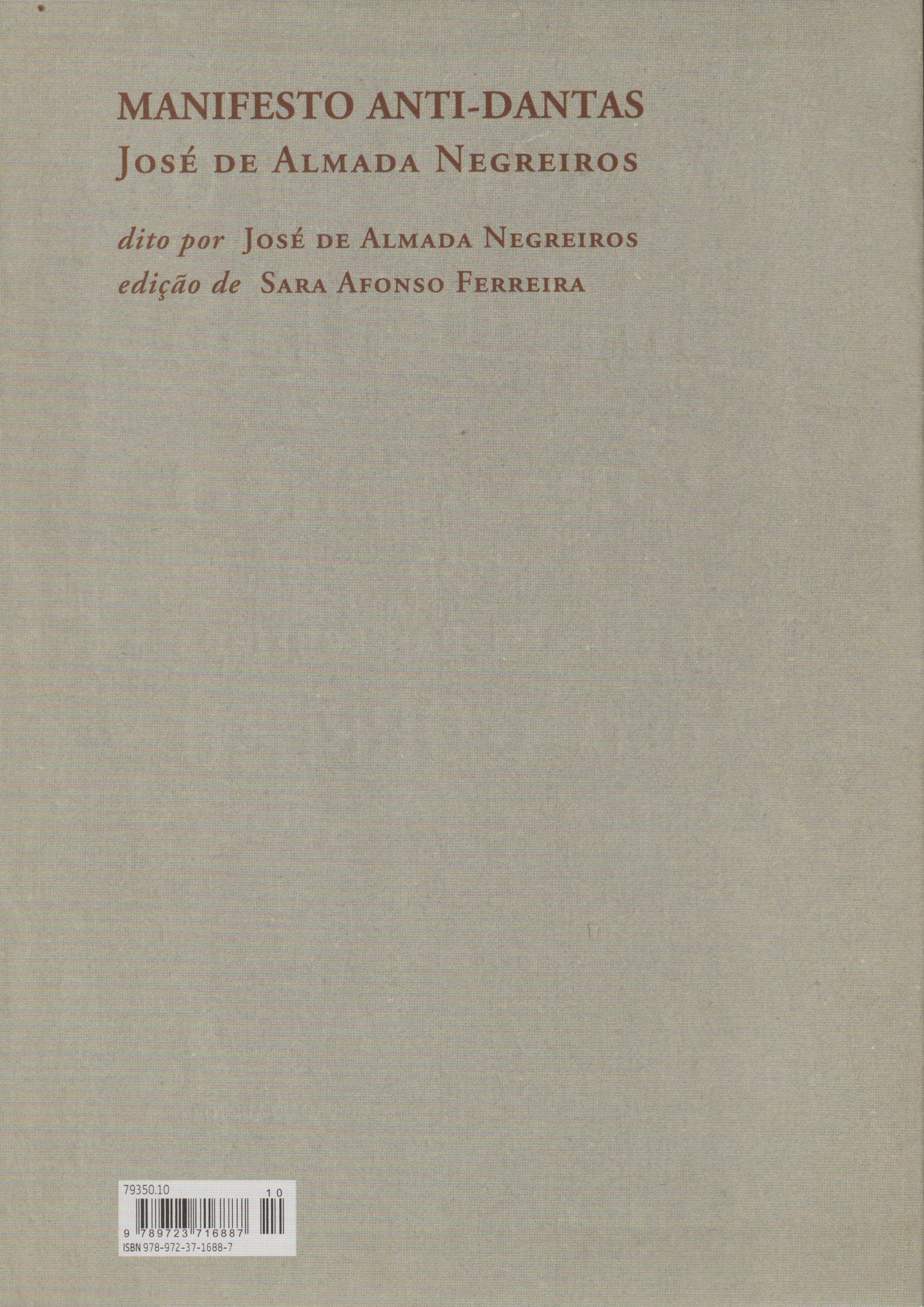 Publicado em 1915 o Manifesto Anti-Dantas foi uma reacção pública e veemente de Almada Negreiros contra a oposição crítica e conservadora ao movimento modernista português, aqui personificada por Júlio Dantas. A edição que agora se apresenta, da responsabilidade de Sara Afonso Ferreira, inclui uma gravação inédita do Manifesto Anti-Dantas lido pelo próprio Almada Negreiros.