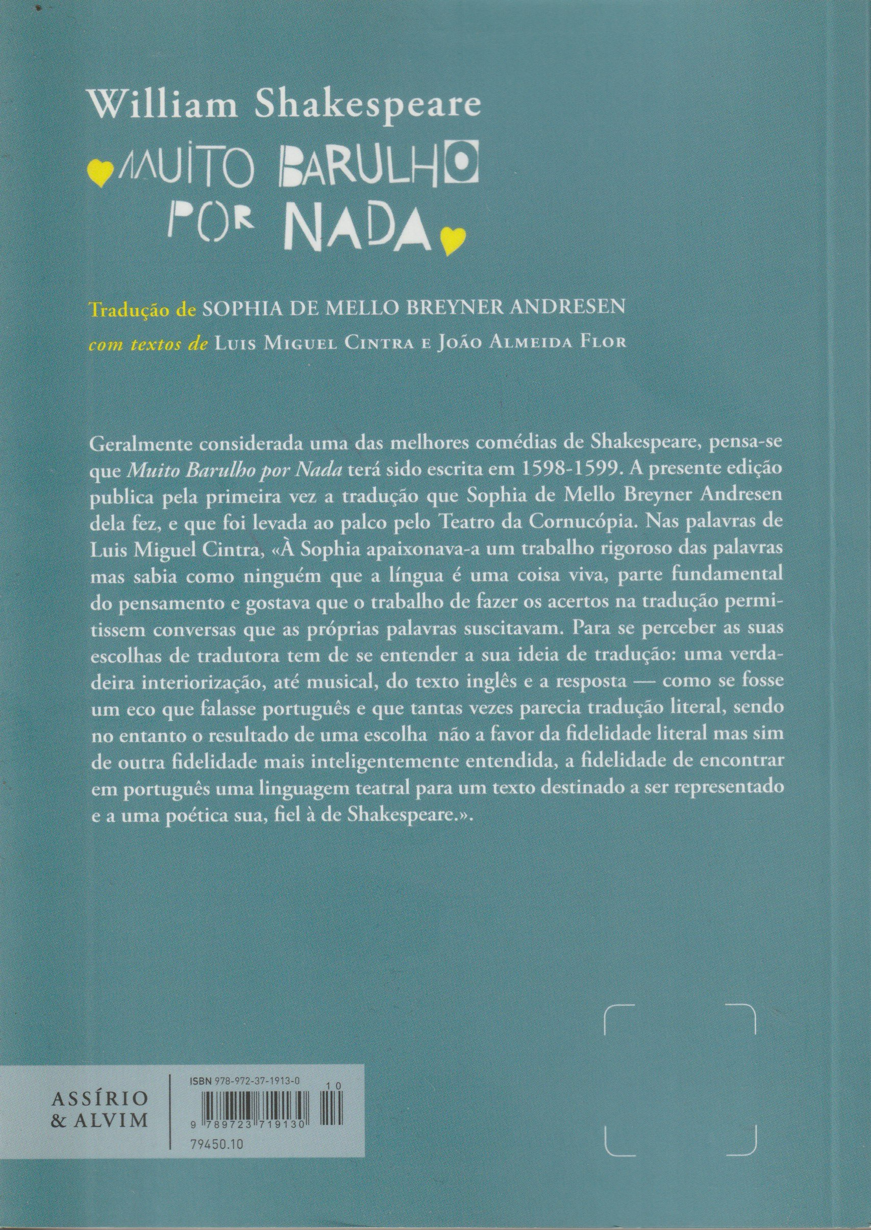 Geralmente considerada uma das melhores comédias de Shakespeare, pensa-se que Muito Barulho por Nada terá sido escrita em 1598-1599. A presente edição publica pela primeira vez a tradução que Sophia de Mello Breyner Andresen dela fez, e que foi levada ao palco pelo Teatro da Cornucópia. Nas palavras de Luis Miguel Cintra, «À Sophia apaixonava-a um trabalho rigoroso das palavras mas sabia como ninguém que a língua é uma coisa viva, parte fundamental do pensamento e gostava que o trabalho de fazer os acertos na tradução permitissem conversas que as próprias palavras suscitavam. Para se perceber as suas escolhas de tradutora tem de se entender a sua ideia de tradução: uma verdadeira interiorização, até musical, do texto inglês e a resposta — como se fosse um eco que falasse português e que tantas vezes parecia tradução literal, sendo no entanto o resultado de uma escolha não a favor da fidelidade literal mas sim de outra fidelidade mais inteligentemente entendida, a fidelidade de encontrar em português uma linguagem teatral para um texto destinado a ser representado e a uma poética sua, fiel à de Shakespeare.».