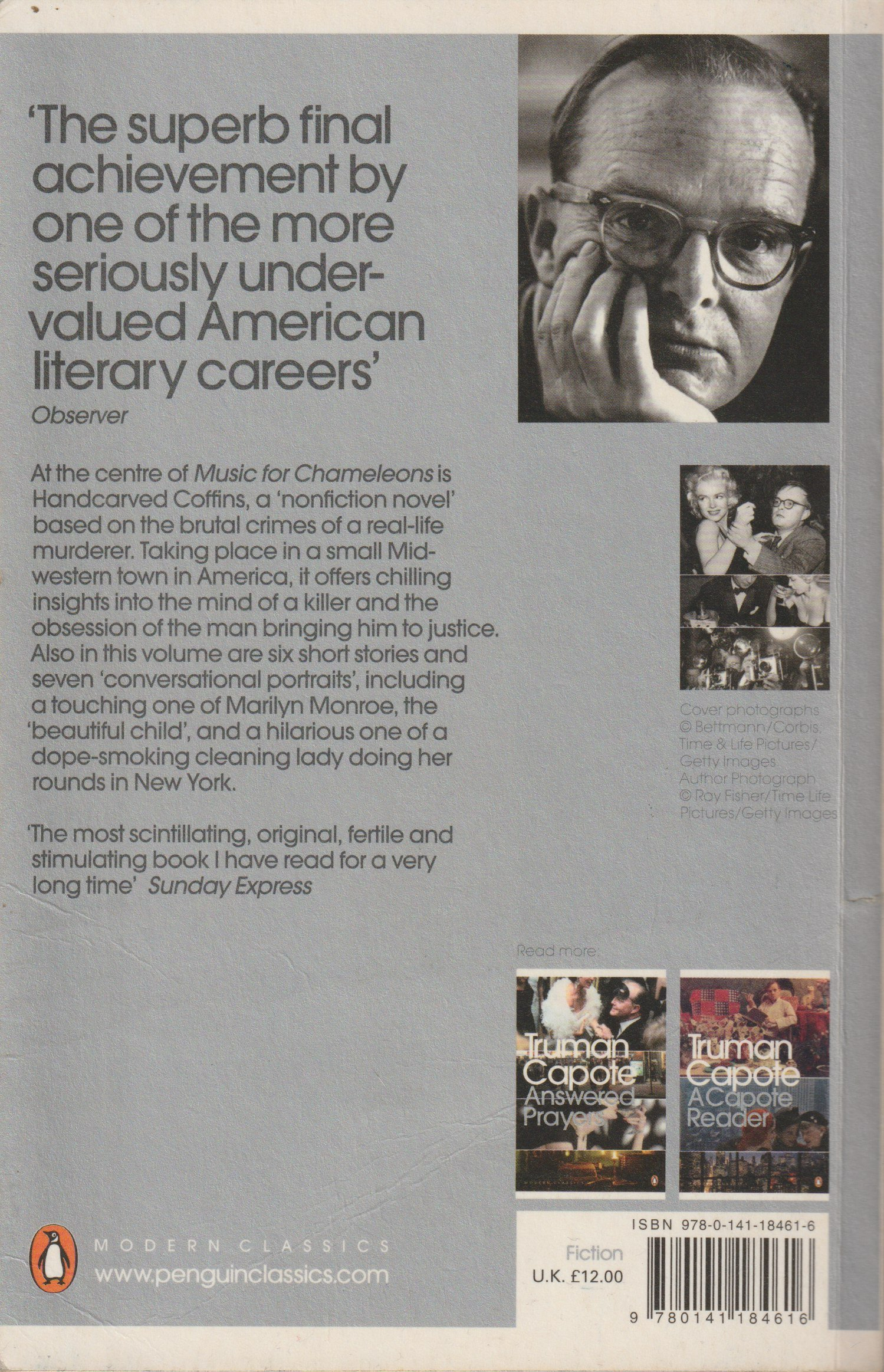 At the centre of Music for Chameleons is Handcarved Coffins, a ‘nonfiction novel’ based on the brutal crimes of a real-life murderer.Taking place in a small Midwestern town in America, it offers chilling insights into the mind of a killer and the obsession of the man bringing him to justice. Also in this volume are six short stories and seven ‘conversational portraits’ including a touching one of Marilyn Monroe, the ‘beautiful child’ and a hilarious one of a dope-smoking cleaning lady doing her rounds in New York.