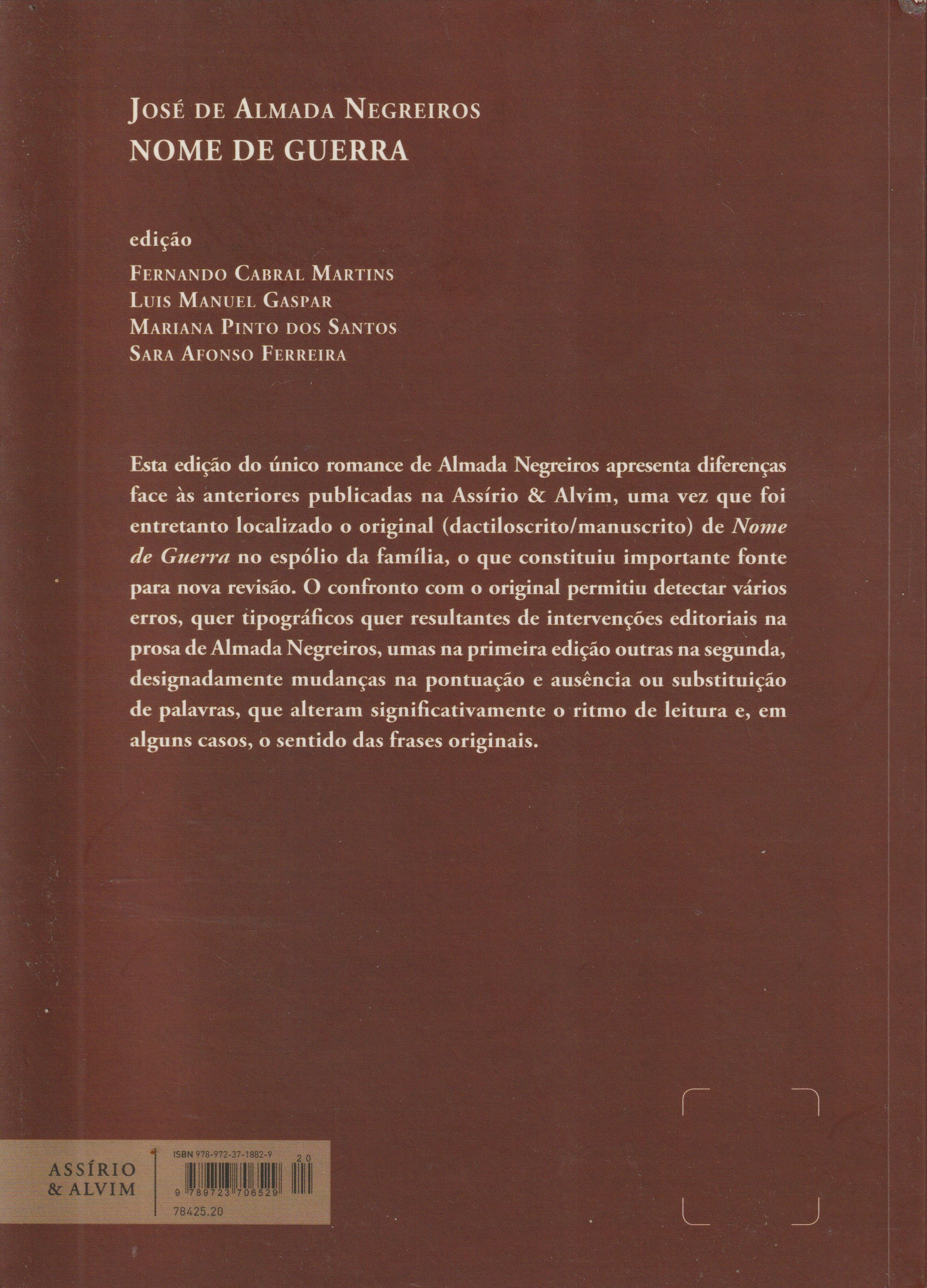Esta edição do único romance de Almada Negreiros apresenta diferenças face às anteriores publicadas na Assírio & Alvim, uma vez que foi entretanto localizado o original (dactiloscrito/manuscrito) de Nome de Guerra no espólio da família, o que constituiu importante fonte para nova revisão.