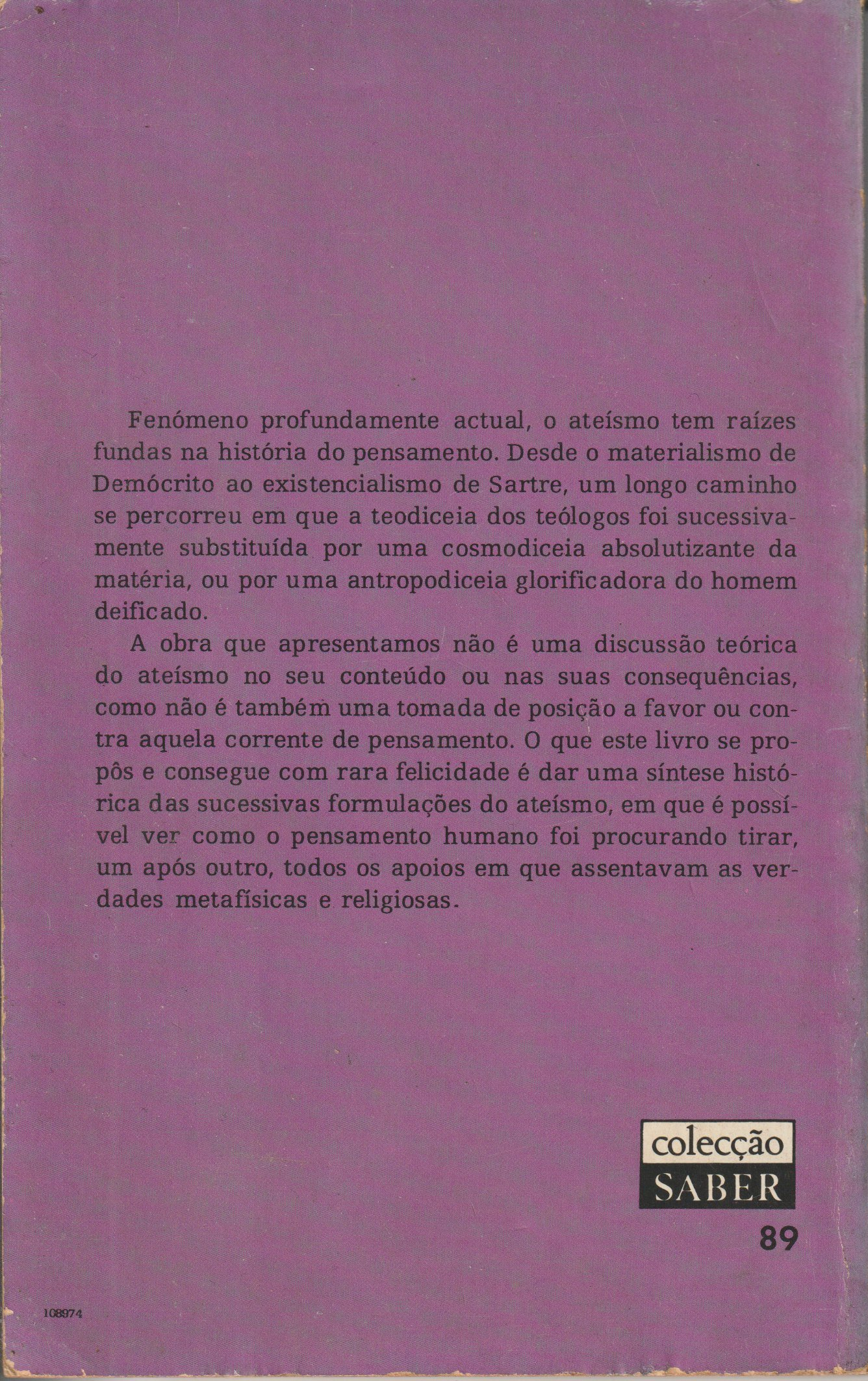 A obra que apresentamos não é uma discussão teórica do ateísmo no seu conteúdo ou nas suas consequências, como não é também uma tomada de posição a favor ou contra aquela corrente de pensamento. O que este livro se propôs e consegue com rara felicidade é dar uma síntese histórica das sucessivas formulações do ateísmo, em que é possível ver como o pensamento humano foi procurando tirar, um após outro, todos os apoios em que assentavam as verdades metafísicas e religiosas.