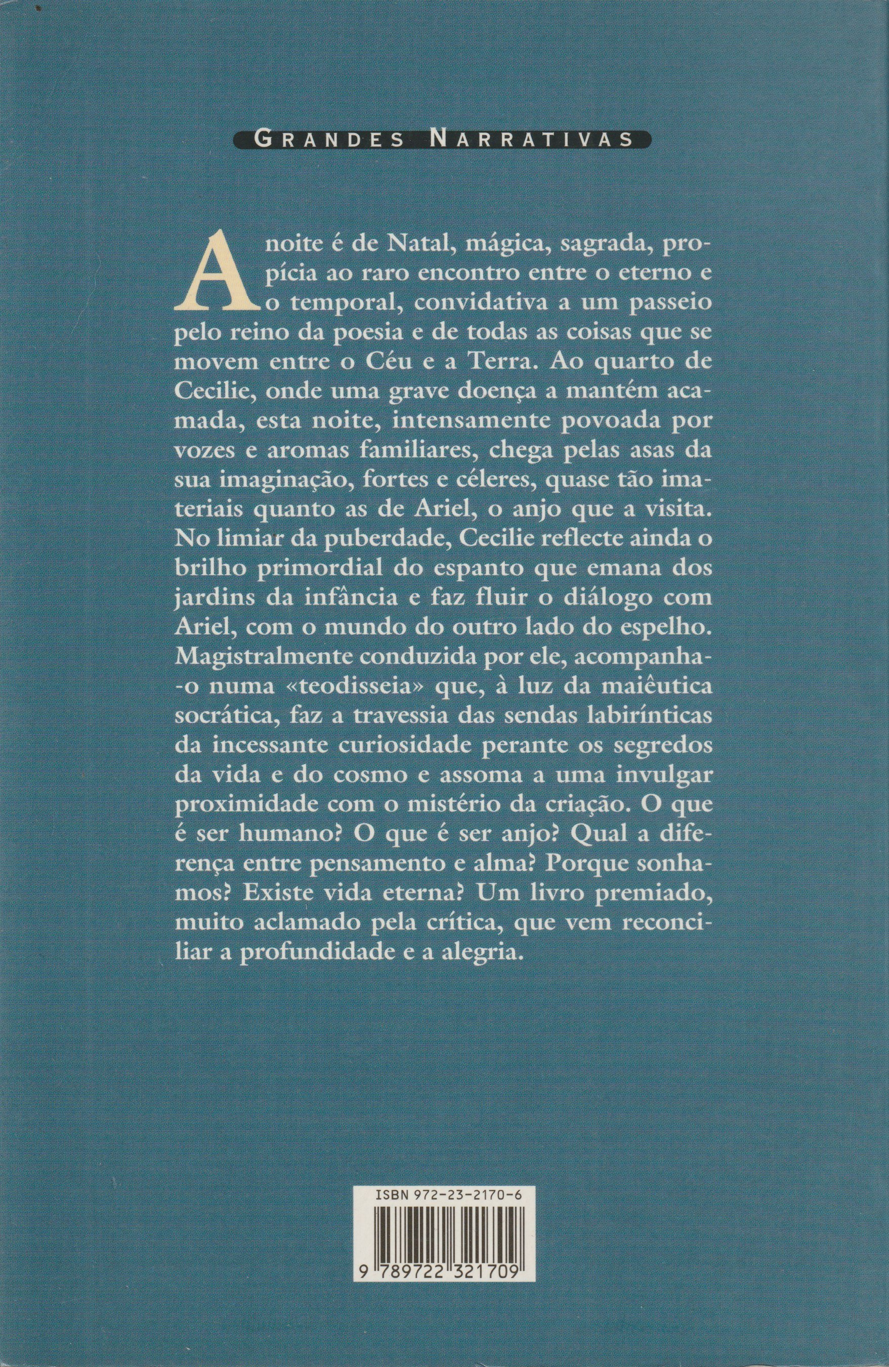 A noite de Natal, mágica, sagrada,propícia ao raro encontro entre o eterno e o temporal, convidativa a um passeio pelo reino da poesia e de todas as coisas que se movem entre o Céu e a Terra. Ao quarto de Cecilie, onde uma grave doença a mantém acamada, esta noite, intensamente povoada por vozes e aromas familiares, chega pelas asas da sua imaginação, fortes e céleres, quase tão imateriais quanto as de Ariel, o anjo que a visita. No limiar da puberdade, Cecilie reflete ainda o brilho primordial do espanto que emana dos jardins da infância e faz fluir o diálogo com Ariel, com o mundo do outro lado do espelho. Acompanhada pelo anjo viaja numa "teodisseia" que, à luz da maiêutica socrática, faz a travessia das sendas labirínticas da incessante curiosidade perante os segredos da vida e do cosmos e assoma a uma invulgar proximidade com o mistério da criação. Um livro premiado que vem reconciliar a profundidade e a alegria.