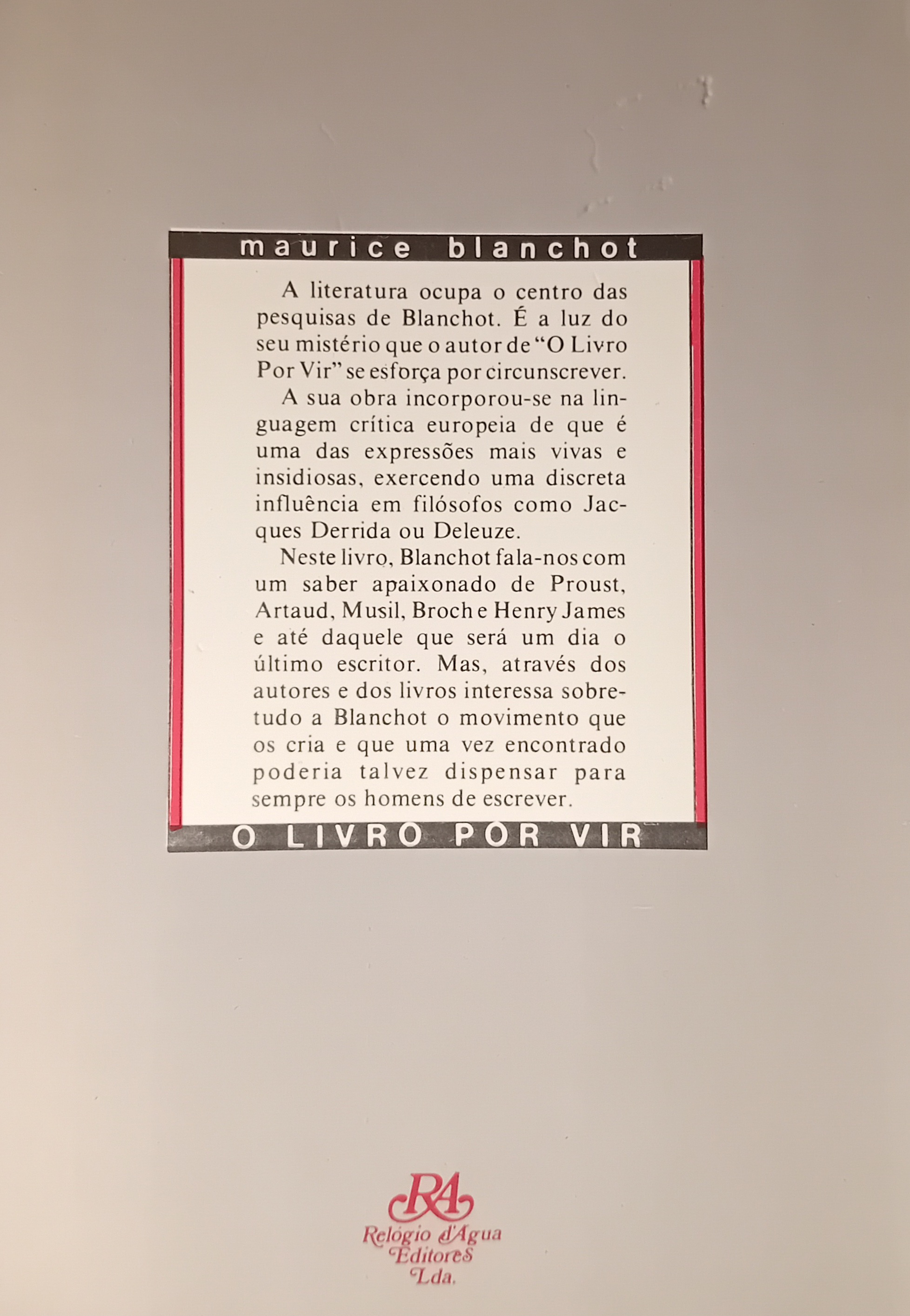 A literatura ocupa o centro das pesquisas de Blanchot. e é a luz do seu mistério que o autor de O Livro por Vir e O Espaço Literário se esforça por circunscrever.