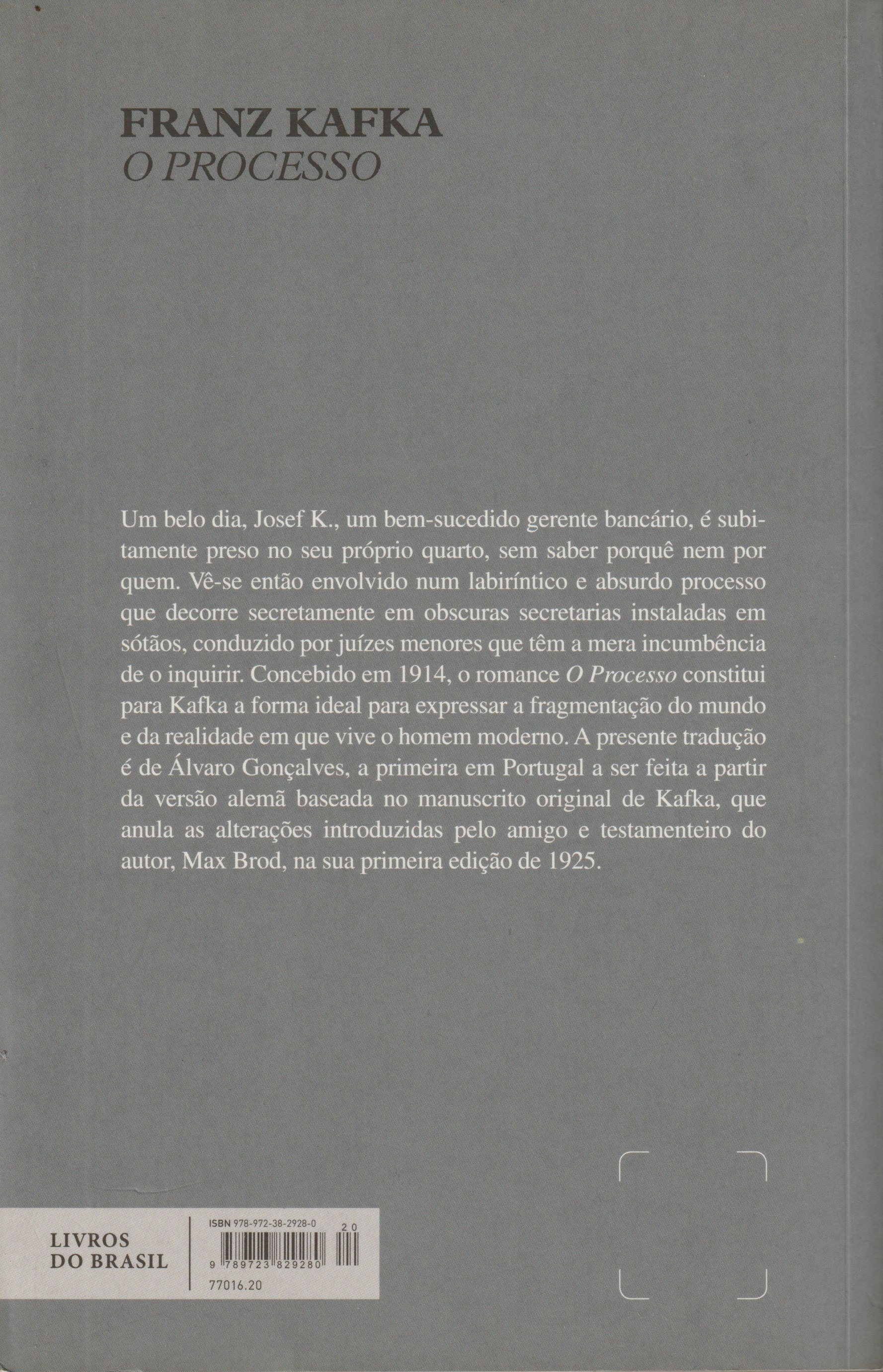 Concebido em 1914, o romance O Processo constitui para Kafka a forma ideal para expressar a fragmentação do mundo e da realidade em que vive o homem moderno. A presente tradução é de Álvaro Gonçalves, a primeira em Portugal a ser feita a partir da versão alemã baseada no manuscrito original de Kafka, que anula as alterações introduzidas pelo amigo e testamenteiro do autor, Max Brod, na sua primeira edição de 1925.