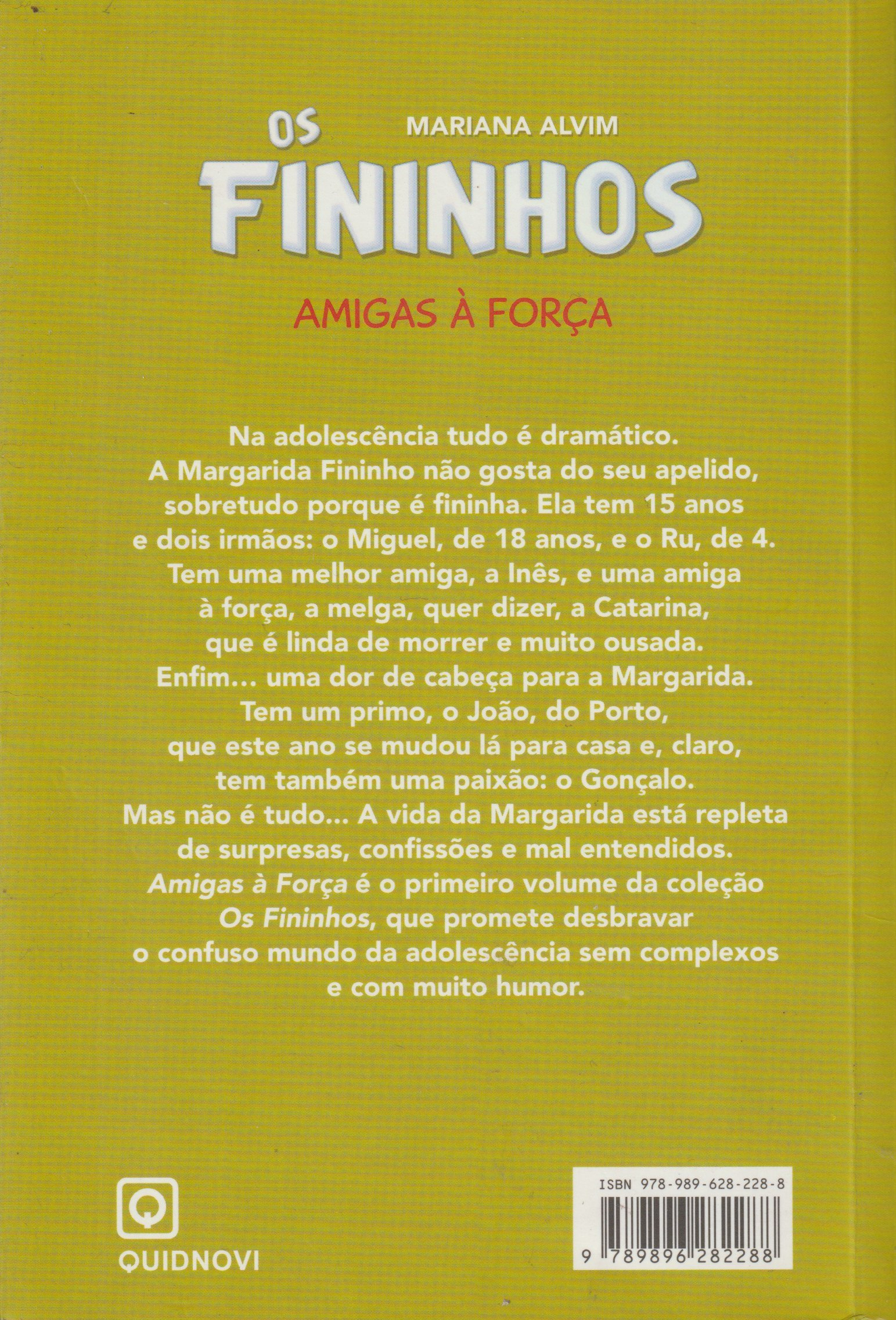 A Margarida Fininho não gosta do seu apelido, especialmente porque é fininha. Tem 15 anos e dois irmãos: o Miguel, de 18 anos, e o Ru, de 4. Tem uma melhor amiga, a Inês, e uma amiga à força, a melga, quer dizer, a Catarina, que é linda de morrer e muito ousada. Enfim… uma dor de cabeça para a Margarida. Tem um primo, o João, do Porto, que este ano se mudou lá para casa e, claro, tem também uma paixão: o Gonçalo. Mas não é tudo... A vida da Margarida está repleta de surpresas, confissões e mal entendidos. Amigas à Força é o primeiro volume da colecção juvenil Os Fininhos, que promete desbravar o confuso mundo da adolescência sem complexos e com muito humor.