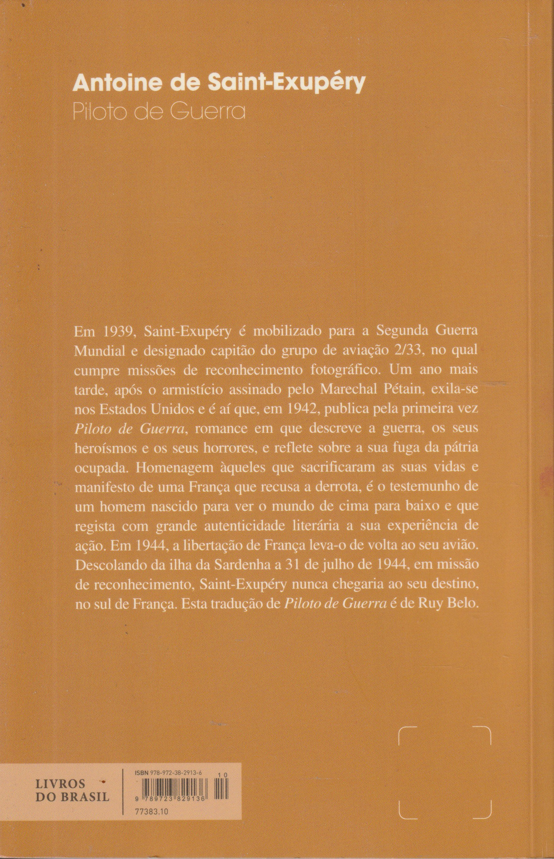 Em 1939, Saint-Exupéry é mobilizado para a Segunda Guerra Mundial e designado capitão do grupo de aviação 2/33, no qual cumpre missões de reconhecimento fotográfico. Um ano mais tarde, após o armistício assinado pelo Marechal Pétain, exila-se nos Estados Unidos e é aí que, em 1942, publica pela primeira vez Piloto de Guerra, romance em que descreve a guerra, os seus heroísmos e os seus horrores, e reflete sobre a sua fuga da pátria ocupada. Homenagem àqueles que sacrificaram as suas vidas e manifesto de uma França que recusa a derrota, é o testemunho de um homem nascido para ver o mundo de cima para baixo e que regista com grande autenticidade literária a sua experiência de ação. Em 1944, a libertação de França leva-o de volta ao seu avião. Descolando da ilha da Sardenha a 31 de julho de 1944, em missão de reconhecimento, Saint-Exupéry nunca chegaria ao seu destino, no sul de França. Esta tradução de Piloto de Guerra é de Ruy Belo.