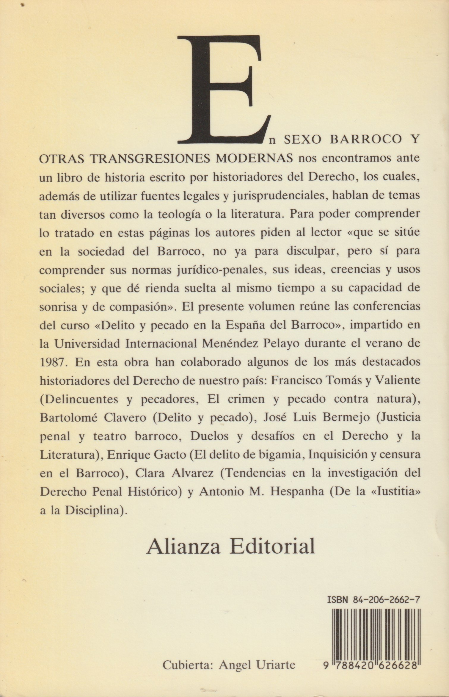 Título: Sexo barroco y otras trangresiones premodernasAutor: AAVVEditora: Alianza EditorialTema: EnsaioEstado: 5Língua: EspanholEncadernação: BrochadoAno: 1990Páginas: 213Dimensões: 13*20Preço: 10,00 €Observações: Esgotado no Mercado
