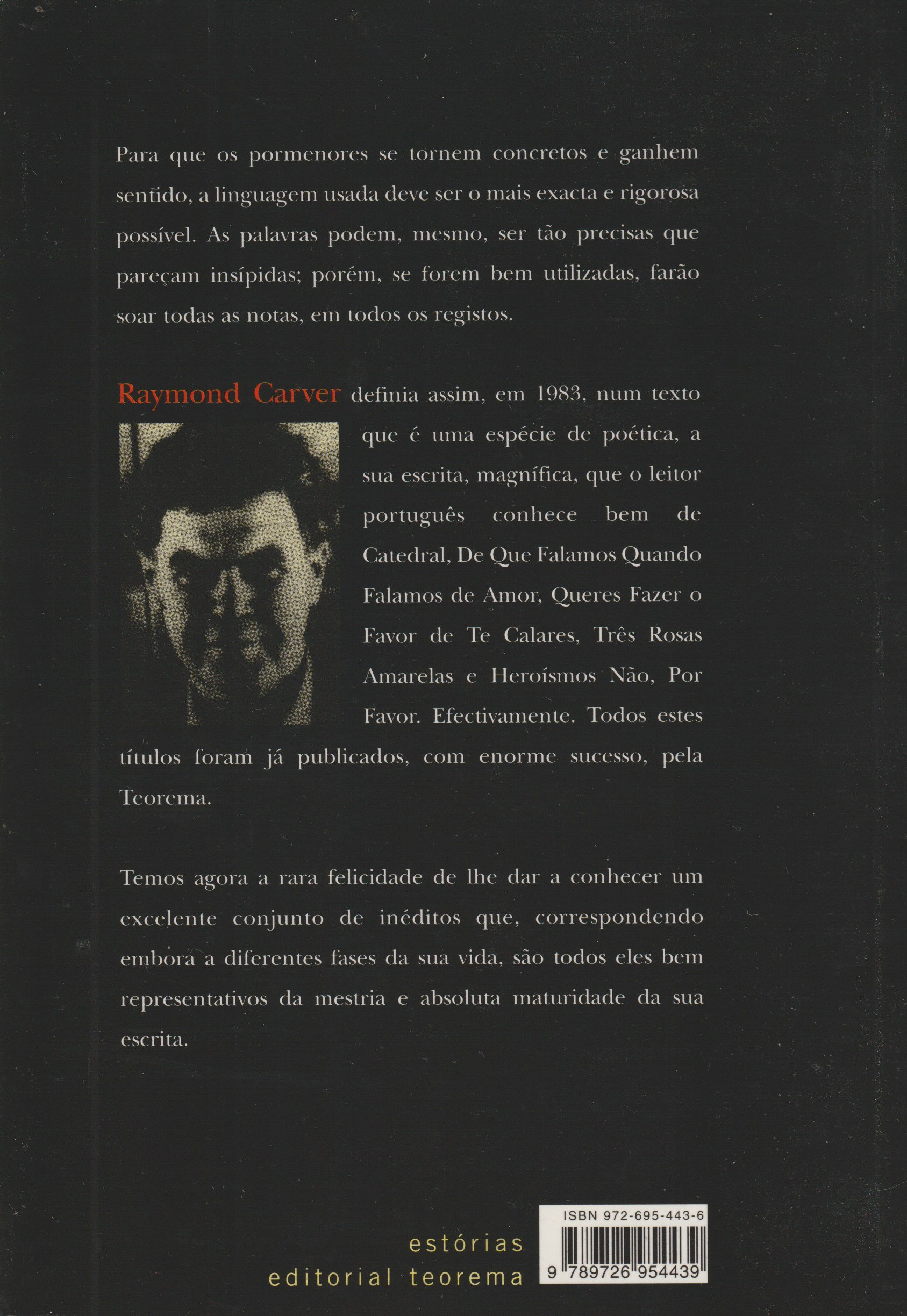 Para que os pormenores se tornem concretos e ganhem sentido, a linguagem usada deve ser o mais exacta e rigorosa possível. As palavras podem, mesmo, ser tão precisas que pareçam insípidas; porém, se forem bem utilizadas, farão soar todas as notas, em todos os registos. Raymond Carver definia assim, em 1983, num texto que é uma espécie de poética, a sua escrita, magnífica, que o leitor português conhece bem de Catedral, De que Falamos Quando Falamos de Amor, Queres Fazer o Favor de Te Calares, Três Rosas Amarelas e Heroísmos Não, Por favor. Efectivamente. Todos estes títulos foram já publicados, com enorme sucesso, pela Teorema. Temos agora a rara felicidade de lhe dar a conhecer um excelente conjunto de inéditos que, correspondendo embora a diferentes fases da sua vida, são todos eles bem representativos da mestria e absoluta maturidade da sua escrita.