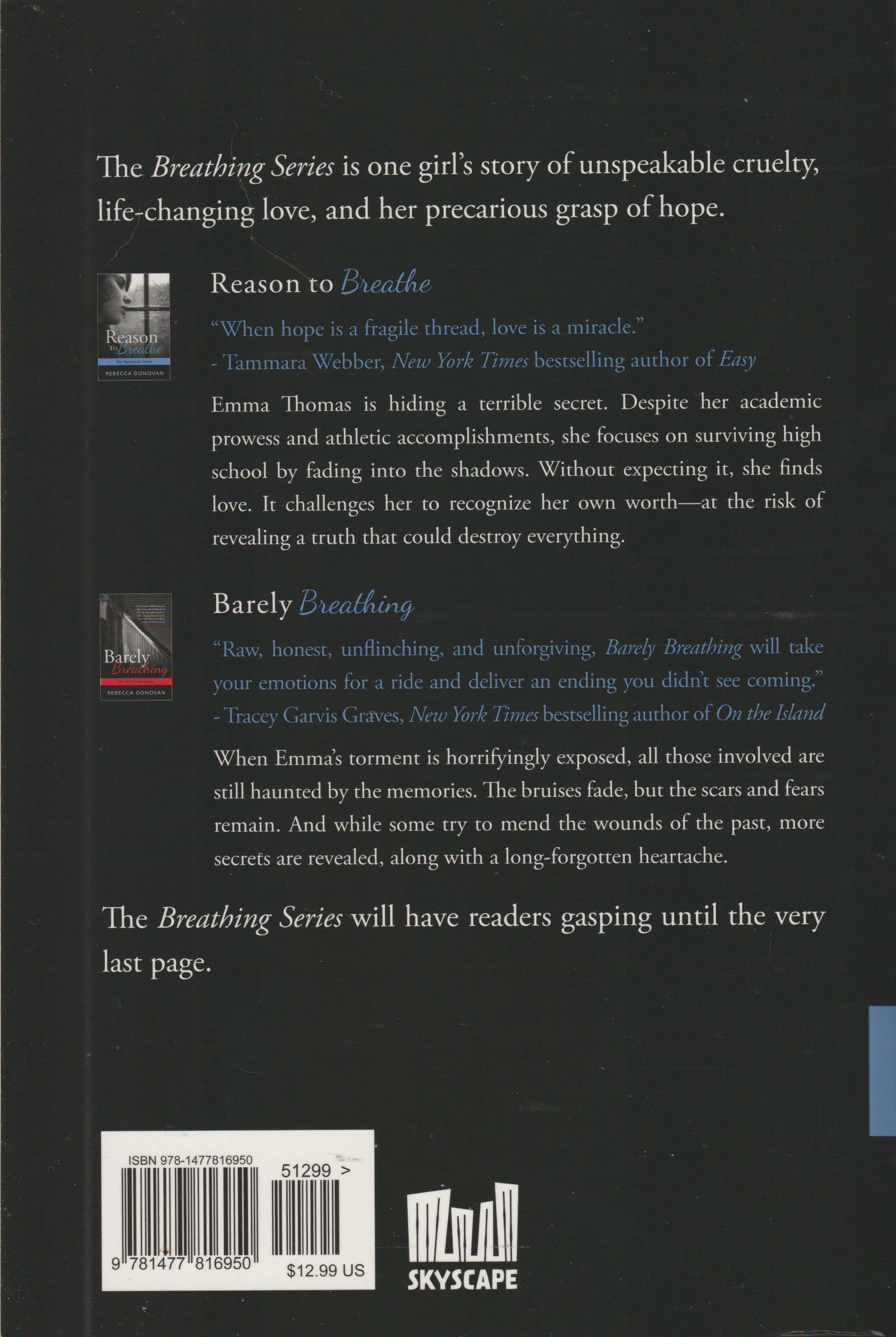 The Breathing Series is one girl’s story of unspeakable cruelty, life-changing love, and her precarious grasp of hope. Reason to Breathe and Barely Breathing are the first two installments of this acclaimed trilogy by USA Today bestselling author, Rebecca Donovan.